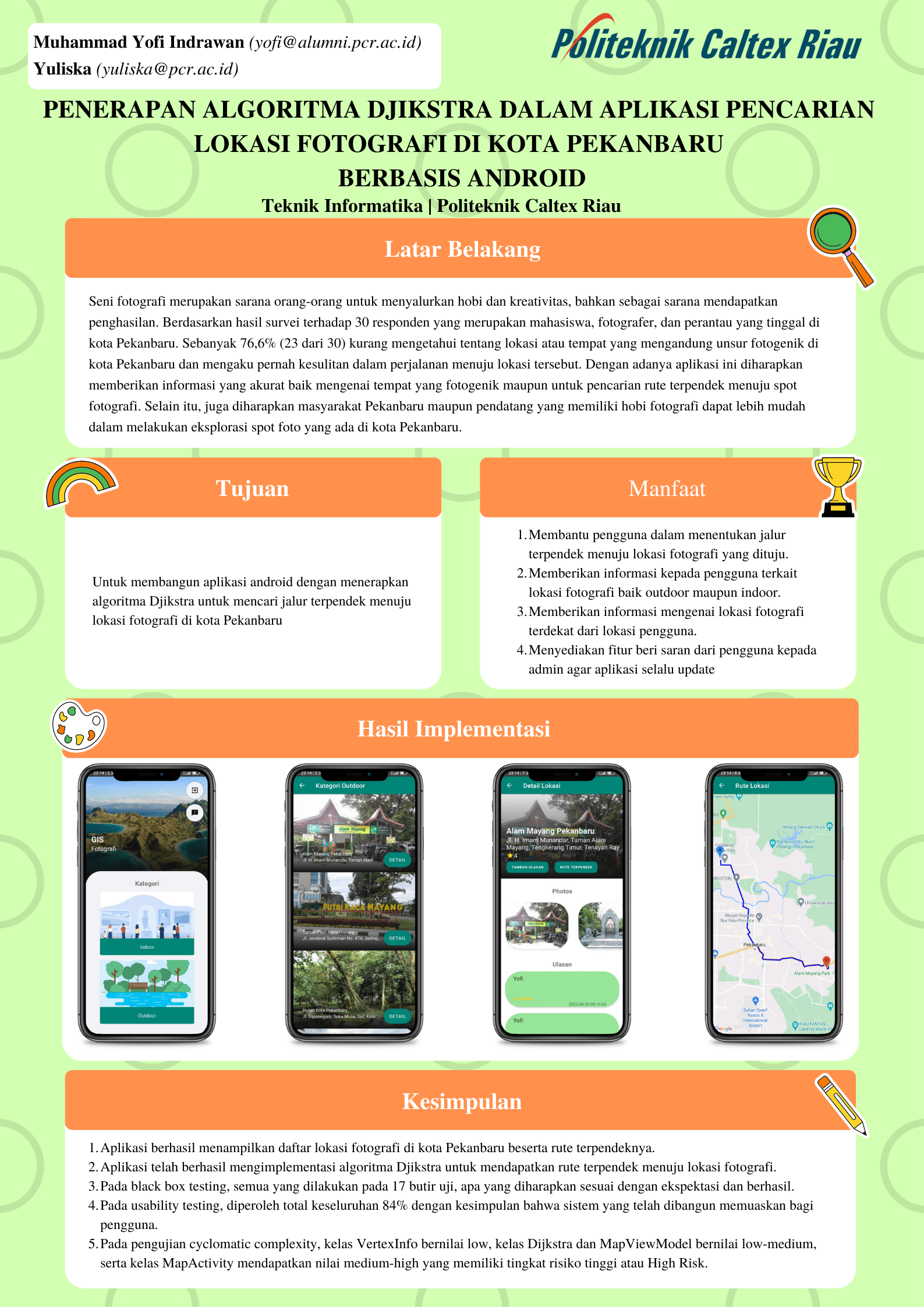 Seni fotografi merupakan sarana orang-orang untuk menyalurkan hobi dan kreativitas, bahkan sebagai sarana mendapatkan penghasilan. Seni fotografi juga banyak diminati oleh masyarakat kota Pekanbaru, terutama remaja dan orang dewasa. Kondisi saat ini, banyak remaja dan orang dewasa di kota Pekanbaru yang berusaha memanfaatkan spot atau lokasi fotografi yang ada di kota Pekanbaru sebagai media pendukung dari hasil kreativitas mereka. Akan tetapi, terdapat beberapa kendala berupa kurangnya informasi yang tersebar di internet mengenai lokasi fotografi di kota Pekanbaru. Oleh karena itu, dibangunlah aplikasi penerapan algoritma djikstra dalam aplikasi pencarian lokasi fotografi berbasis android. Algoritma djikstra merupakan sebuah algoritma pencarian jarak yang memiliki kemampuan optimal dan komplit dalam memecahkan sebuah permasalahan yang berkaitan dengan pencarian sebuah rute dengan jarak terdekat. Hasil penelitian ini adalah aplikasi dapat membantu memberikan informasi mengenai tempat yang fotogenik serta pencarian rute terdekat menuju lokasi spot fotografi tersebut. Pada pengujian black box testing, aplikasi dan website berjalan dengan baik sesuai dengan yang diharapkan. Pengujian usability testing memiliki total hasil perhitungan keseluruhan 84% dengan kesimpulan bahwa sistem yang dibangun memuaskan pengguna. Pada pengujian cyclomatic complexity yang dilakukan dengan menggunakan plugin CodeMR menghasilkan nilai kompleksitas low pada kelas VertexInfo, low-medium pada kelas Djikstra dan kelas MapViewModel, serta medium-high pada kelas MapActivity yang memiliki tingkat risiko tinggi atau High Risk.