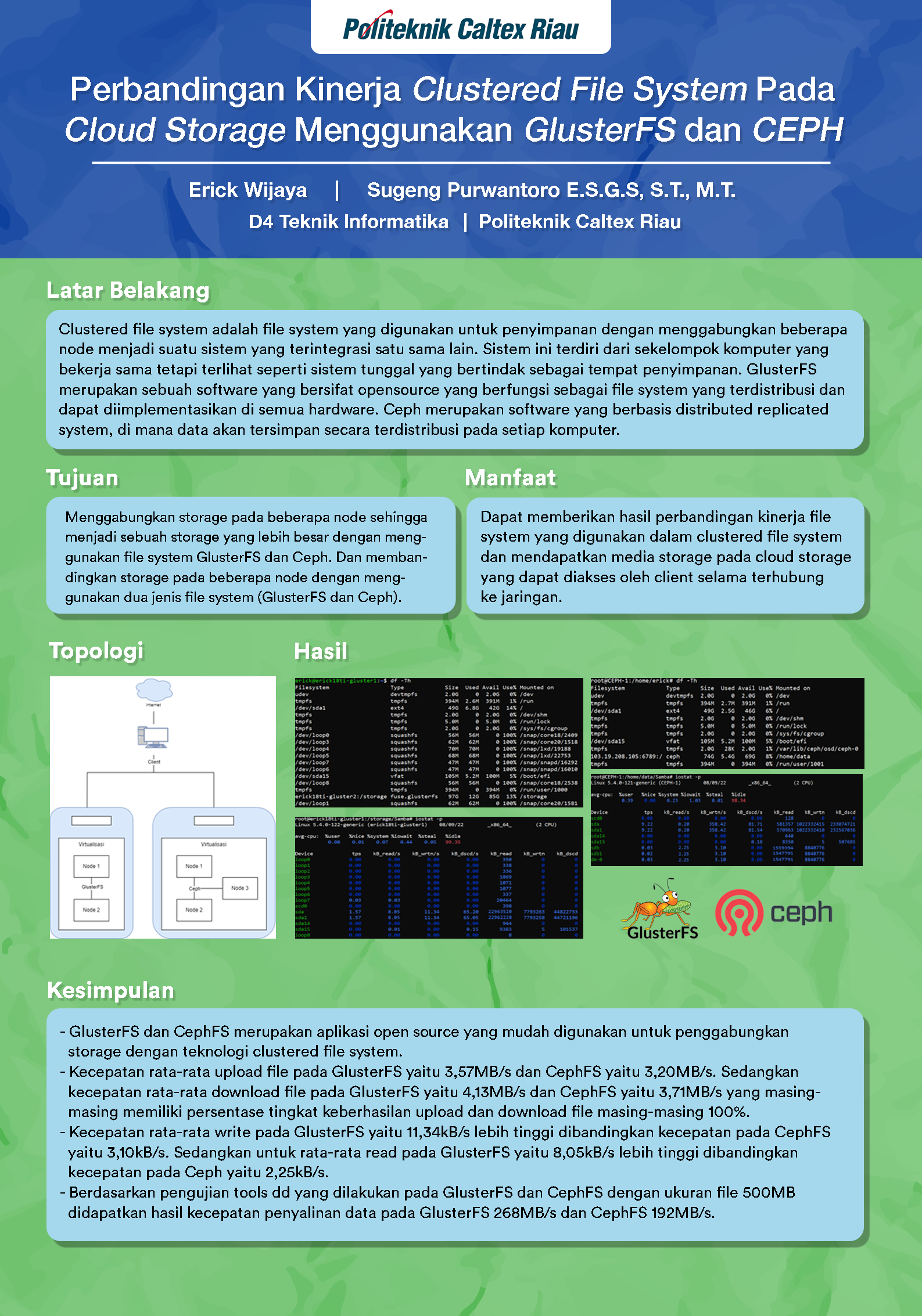 Perkembangan teknologi yang cepat menyebabkan kebutuhan penyimpanan data semakin berkembang. Salah satu untuk memperbesar kapasitas penyimpanannya dengan metode Clustered file system. Pada pengujian ini membandingkan kecepatan upload dan download file dan write/read file pada GlusterFS yang menggunakan 2 node sebagai peer dan CephFS menggunakan 3 node yaitu 1 node berperan sebagai MON yang berfungsi untuk memonitoring dan memetakan cluster, 2 node sebagai OSD yang berfungsi sebagai tempat penyimpanan data. Client dapat melakukan upload dan download file dengan menggunakan layanan storage yaitu Samba. Ukuran file yang digunakan adalah 500MB dan pengujian write/read file menggunakan file yang berada di server dengan ukuran 500MB, 1 kali pengujian, dan menggunakan aplikasi iostat. Pengujian transfer file menggunakan file dengan ukuran 500MB, 10 kali pengujian, dan menggunakan aplikasi teracopy. Dari pengujian maka diperoleh hasil untuk upload file bahwa metode GlusterFS lebih cepat 11,5% daripada Ceph dengan rata-rata upload file GlusterFS lebih tinggi sebesar 3,57MB/s dan CephFS sebesar 3,20MB/s, hasil yang diperoleh untuk download file bahwa metode GlusterFS lebih cepat 11,3% daripada Ceph dengan rata-rata upload file GlusterFS lebih tinggi 4,13MB/s dan CephFS sebesar 3,71MB/s, hasil yang diperoleh untuk write file bahwa metode GlusterFS lebih cepat 106% daripada Ceph dengan perbandingan sebesar 11,34kB/s dan 8,05kB/s, untuk read file bahwa metode GlusterFS lebih cepat 37% daripada Ceph dengan perbandingan sebesar 3,10kB/s dan 2,25kB/s. Dari analisis tersebut bahwa metode GlusterFS lebih baik 100% dengan menggunakan 2 node yang masing-masing memiliki virtual disk yang dapat digabung dan mempercepat performancenya, sedangkan Ceph terbagi 3 node dimana 1 node digunakan sebagai MON yang berisikan penyimpanan metadata dan pool data yang memiliki proses lebih banyak sehingga mengakibatkan turunnya performance pada file system tersebut.