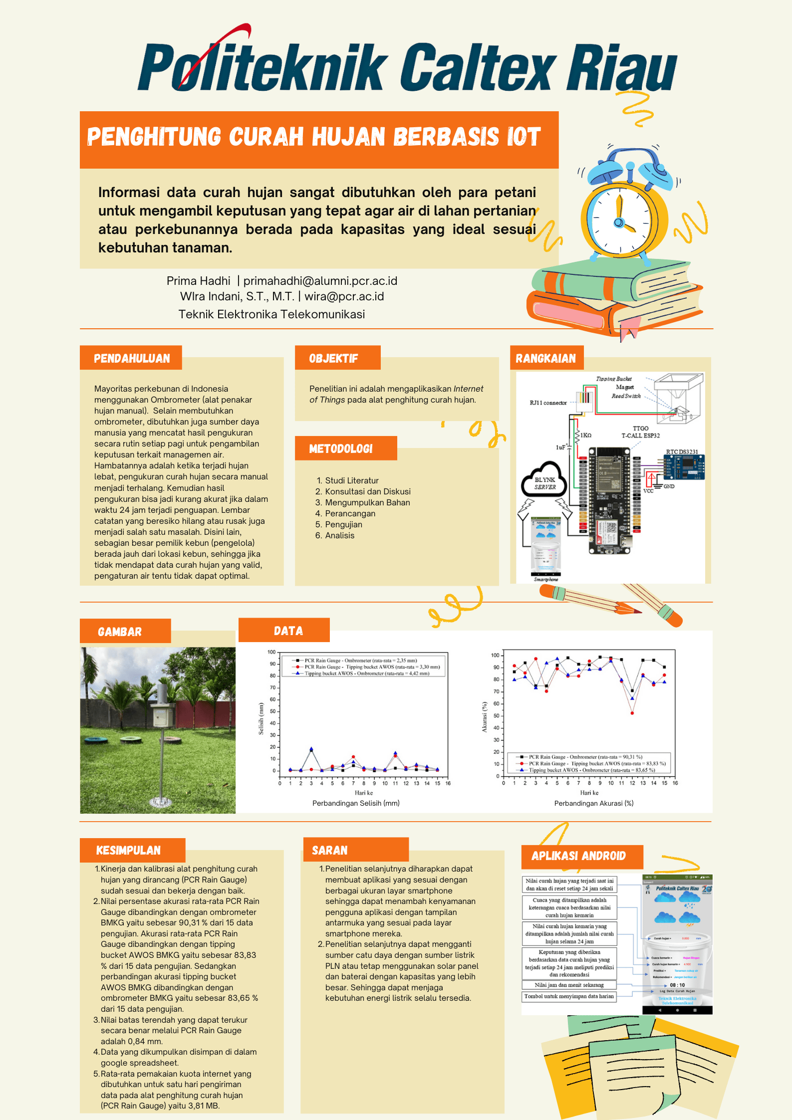 Informasi data curah hujan sangat dibutuhkan oleh para petani untuk mengambil keputusan yang tepat agar air di lahan pertanian atau perkebunannya berada pada kapasitas yang ideal sesuai kebutuhan tanaman. Perkebunan besar dengan sistem pengelolaan air yang baik menggunakan ombrometer (alat penakar hujan manual) dan sumber daya manusia yang mencatat data secara rutin setiap pagi. Terjadi hambatan ketika pagi hari terjadi hujan lebat, pengukuran curah hujan menjadi terhalang. Guna mengatasi masalah tersebut, diperlukan alat penghitung curah hujan secara otomatis. Penelitian ini adalah mengaplikasikan Internet of Things pada alat penghitung curah hujan. Alat penghitung curah hujan yang digunakan adalah tipping bucket dan dilengkapi dengan sensor reed switch. Reed switch berfungsi mendeteksi pergerakan tipping bucket. Hasil yang diperoleh dari alat yang dirancang telah berhasil mengirimkan data curah hujan dalam satuan milimeter (mm), kondisi cuaca, prediksi dan rekomendasi menggunakan komunikasi seluler ke internet dengan mikrokontroler TTGO T-CALL ESP32 dan server blynk. Kemudian aplikasi android menampilkan data tersebut. Data harian dapat disimpan ke dalam google spreadsheet. Nilai persentase akurasi alat yang dirancang dibandingkan dengan ombrometer BMKG yaitu sebesar 90,31 % dari 15 data pengujian. Dan pada pengujian akurasi alat yang dirancang dibandingkan dengan tipping bucket AWOS BMKG yaitu sebesar 83,83 % dari 15 data pengujian.