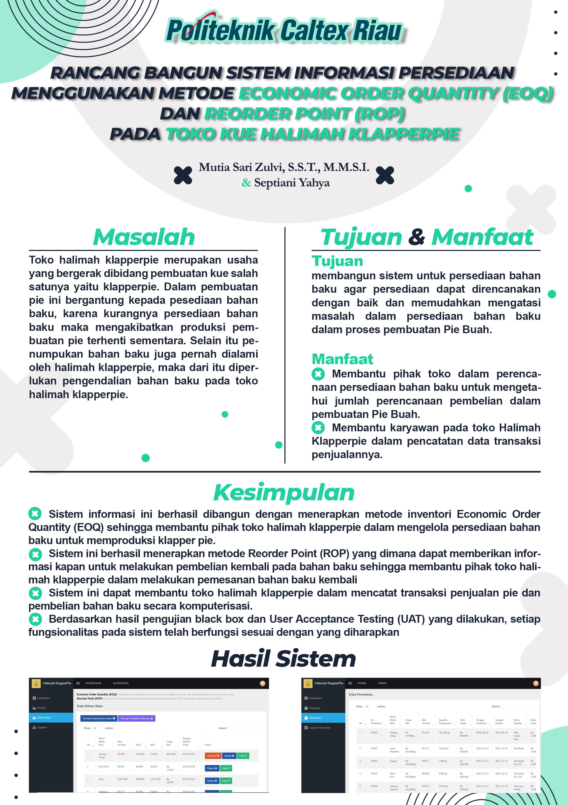 Halimah Klapperpie merupakan salah satu usaha yang memproduksi berbagai jenis kue. Dari berbagai jenis kue yang dijual oleh toko Halimah Klapperpie yang lebih banyak diminati yaitu Pie Buah. Dengan banyaknya peminat Pie Buah sehingga sulit menentukan persediaan bahan baku untuk membuat Pie Buah setiap harinya. Jumlah pemesanan selama ini hanya diperkirakan saja sesuai dengan kebutuhan yang diperlukan sehingga terjadi penumpukan bahan baku dan kurangnya persediaan bahan baku, hal ini akan menyebabkan kerugian atau pendapatan yang menurun pada Pie Buah. Jika penumpukan bahan baku terlalu lama maka akan mempengaruhi kualitas dari bahan baku itu sendiri sehingga hasil dalam pembuatan Pie menjadi tidak maksimal. Oleh karena itu diperlukan sebuah sistem persediaan menggunakan metode Economic Order Quantity (EOQ) untuk mengetahui jumlah pemesanan optimum dari stok persediaan bahan baku tersebut. Dengan adanya pengendalian bahan baku ini mampu menunjang kelancaran produksi sebuah Pie Buah. Selain itu menggunakan Reorder Point (ROP) untuk menentukan pembelian kembali pada bahan baku yang ada ditoko. Dan menggunakan Safety Stock (SS) sebagai pengaman bahan baku terhadap hal yang tidak diinginkan terjadi. Dengan adanya sistem ini diharapkan mampu membantu pihak toko dalam melakukan peralaman bahan baku dan perkiraan biaya. Berdasarkan pengujian yang telah dilakukan, hasil pengujian black box testing dan User Acceptance Testing (UAT) yaitu seluruh fungsionalitas pada sistem dapat berjalan 100% sesuai dengan yang diharapkan, dan sesuai dengan kebutuhan dan permintaan dari toko Halimah Klapperpie.