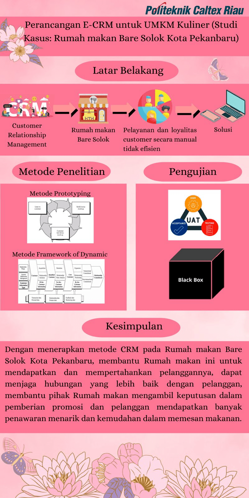 Customer Relationship Management adalah sistem informasi terintegrasi yang digunakan untuk merencanakan, menjadwalkan, dan mengontrol aktivitas penjualan dalam suatu organisasi. UMKM dikelola oleh masyarakat yang memiliki peranan penting dalam perekonomian Indonesia. Kategori usaha yang menonjol khususnya diwilayah Kota Pekanbaru adalah usaha kuliner. Rumah makan Bare Solok Kota Pekanbaru adalah salah satu Usaha Mikro Kecil dan Menengah di Kota Pekanbaru. Rumah makan Bare Solok Kota Pekanbaru kesulitan untuk merespon customer yang melakukan COD melalui telepon saja sehingga pelayanan dan loyalitas rendah dan pelayanan yang diberikan tidak maksimal meskipun rumah makan ini sudah menggunakan sistem Point of Sales (POS). Rumah makan Bare Solok Kota Pekanbaru belum memiliki strategi khusus untuk menarik customer baru dan mempertahankan customer lama. Berdasarkan permasalahan ini dikembangkan sebuah sistem yang mencakup 3 perspektif Customer Relationship Management. Sistem dibangun menggunakan Framework Codeigniter dan database MySQL dengan penerapan metode prototyping dikolaborasikan dengan metode Framework of Dynamic sebagai salah satu fitur yang terdapat pada CRM. Dengan adanya sistem ini mempermudah pelaku usaha dalam menjual dan memasarkan produk sehingga dapat memaksimalkan penjualan dan meningkatkan loyalitas. Berdasarkan hasil pengujian User Acceptance testing dan pengujian Black Box Testing, diperoleh hasil 100% sehingga sistem telah diterima dengan baik.