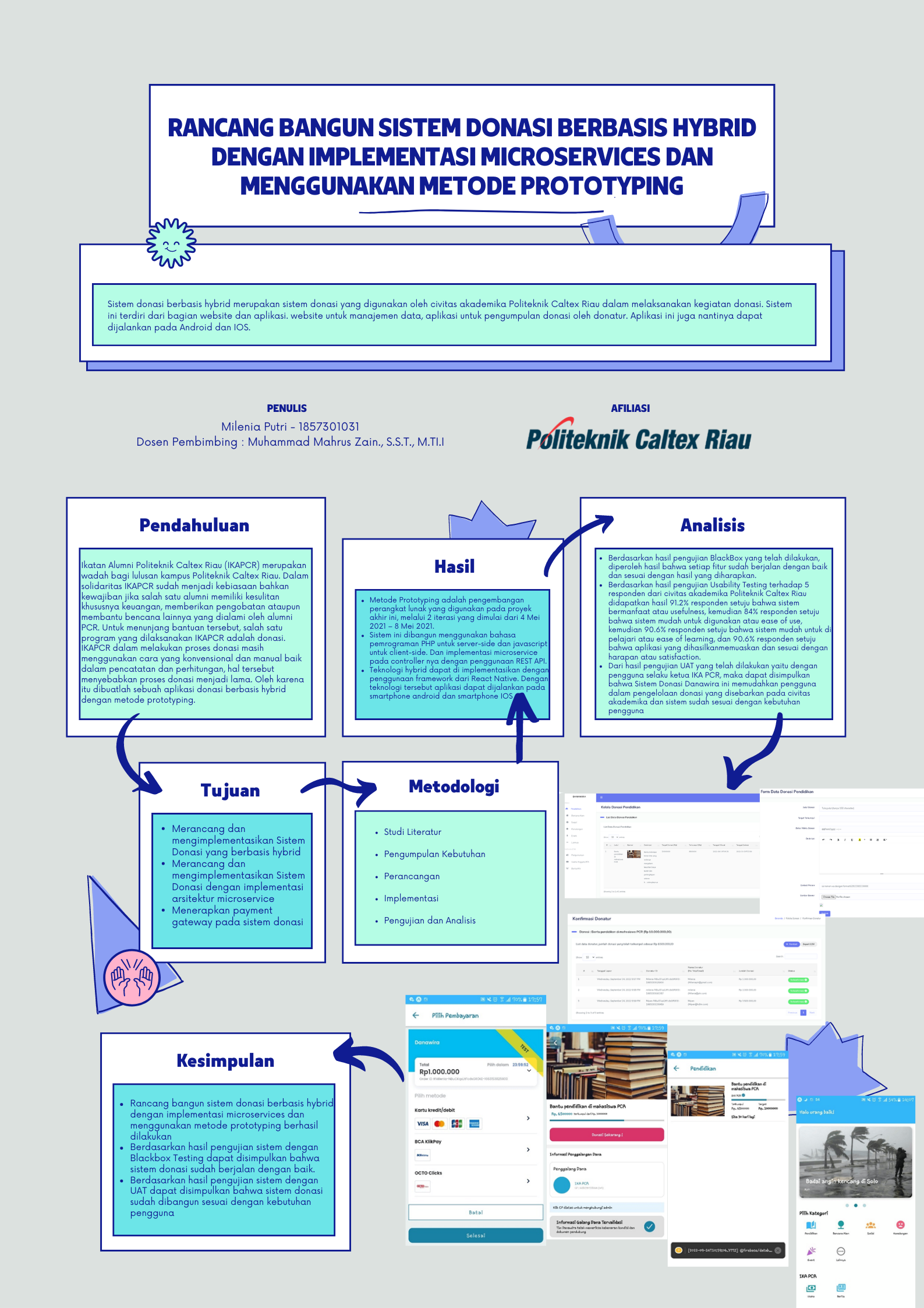 Ikatan Alumni Politeknik Caltex Riau (IKAPCR) merupakan wadah bagi lulusan kampus Politeknik Caltex Riau. Dalam solidaritas IKAPCR sudah menjadi kebiasaan bahkan kewajiban jika salah satu alumni memiliki kesulitan khususnya keuangan, memberikan pengobatan ataupun membantu bencana lainnya yang dialami oleh alumni PCR. Untuk menunjang bantuan tersebut, salah satu program yang dilaksanakan IKAPCR adalah donasi. IKAPCR dalam melakukan proses donasi masih menggunakan cara yang konvensional dan manual baik dalam pencatatan dan perhitungan, hal tersebut menyebabkan proses donasi menjadi lama. Oleh karena itu dibuatlah sebuah aplikasi donasi berbasis hybrid dengan metode prototyping. Hasil dari penelitian ini berupa sistem donasi yang terdiri atas website dan aplikasi. Untuk manajemen data akan dilakukan pada bagian website oleh admin. Sedangkan untuk transaksi donasi akan dilakukan pada bagian aplikasi. Penelitian ini menggunakan 4 pengujian, untuk pengujian Blackbox memberi hasil bahwa setiap fitur sudah berjalan dengan baik dan sesuai dengan hasil yang diharapkan. Pengujian Usability Testing menghasilkan 91.2% untuk usefulness, 84% untuk ease of use, 90.6% untuk ease of learning, dan 90.6% untuk satisfaction. Pengujian User Acceptance Test menghasilkan bahwa sistem donasi danawira ini memudahkan pengguna dalam pengelolaan donasi yang disebarkan pada civitas akademika dan sistem sudah sesuai dengan kebutuhan pengguna. Dan pengujian efektivitas dan efisiensi hybrid apps menghasilkan bahwa aplikasi donasi lebih tinggi 35,2% dari donasi konvensional secara efisiensi dan efektivitasnya.