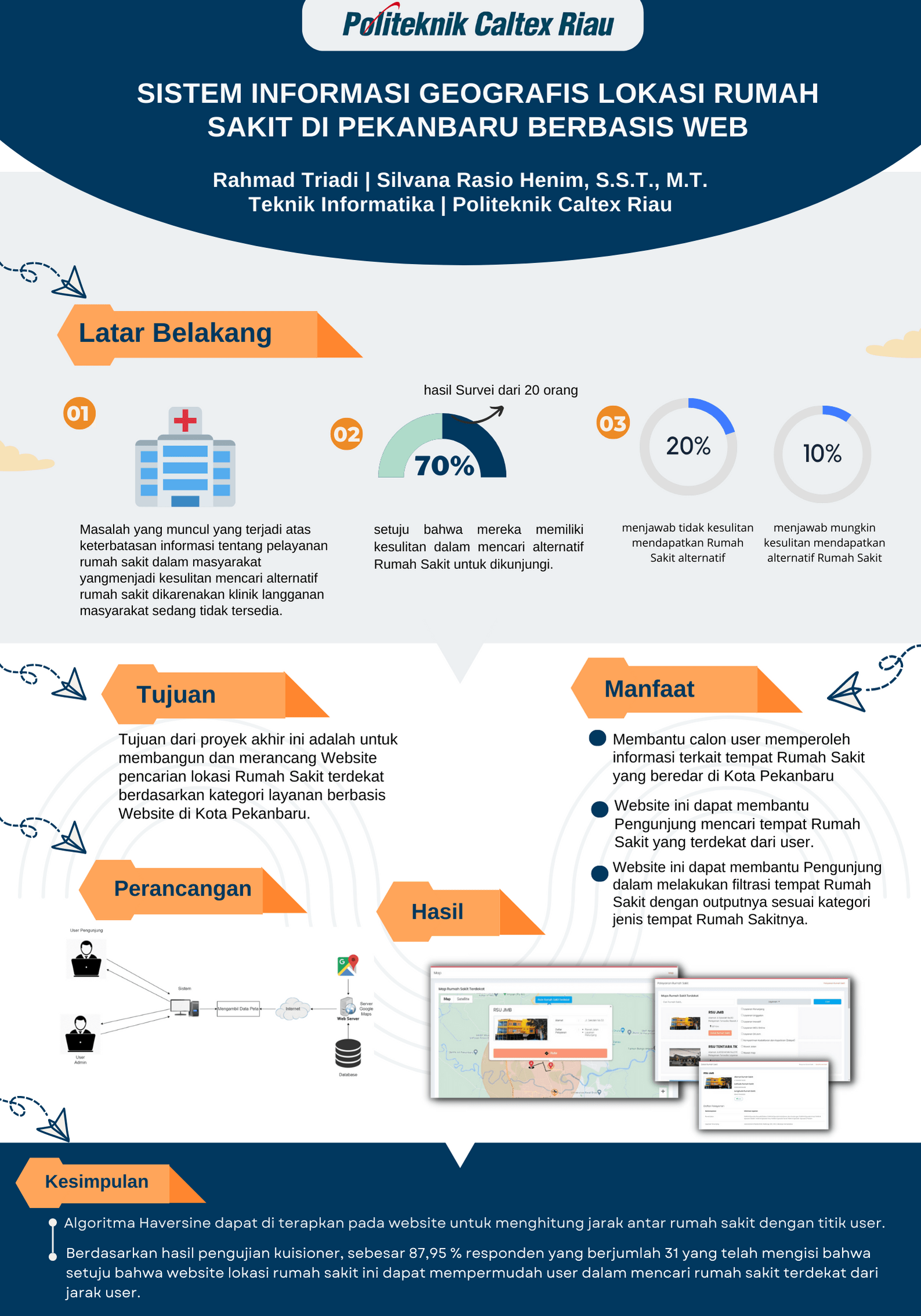 Rumah Sakit merupakan fasilitas Kesehatan yang dibutuhkan untuk pertolongan pertama pada saat terjadi suatu keadaan darurat yang membahayakan kesehatan. Website ini dibangun dengan adanya fitur filtrasi data yang akan mengelompokkan Rumah Sakit berdasarkan kategorinya, website ini menggunakan Google Maps API yang diintegrasikan ke dalam website. Data yang digunakan berupa data spasial yaitu koordinat latitude dan koordinat longitude serta data deskriptif dari Rumah Sakit tersebut. Metode yang digunakan dalam menentukan jarak dalam website ini adalah metode Haversine yang didalamnya terdapat persamaan yang dapat dikatakan sangat akurat dalam menentukan jarak diantara dua titik. Pada website ini Metode Haversine nantinya akan menentukan jarak terdekat Rumah Sakit dari lokasi user berada. Pengembangan website ini diharapkan dapat membantu user mendapatkan informasi yang dibutuhkan mengenai Lokasi Rumah Sakit di Kota Pekanbaru. Berdasarkan hasil pengujian yang dilakukan terhadap website yang dibangun menggunakan black box, didapatkan hasil bahwa website sudah 100% berhasil dibangun sesuai yang diharapkan. Selanjutnya pengujian kuesioner, sebesar 87.95% setuju fitur aplikasi telah berjalan sesuai dengan fungsinya dan bermanfaat bagi user dalam mencari Lokasi Rumah Sakit.