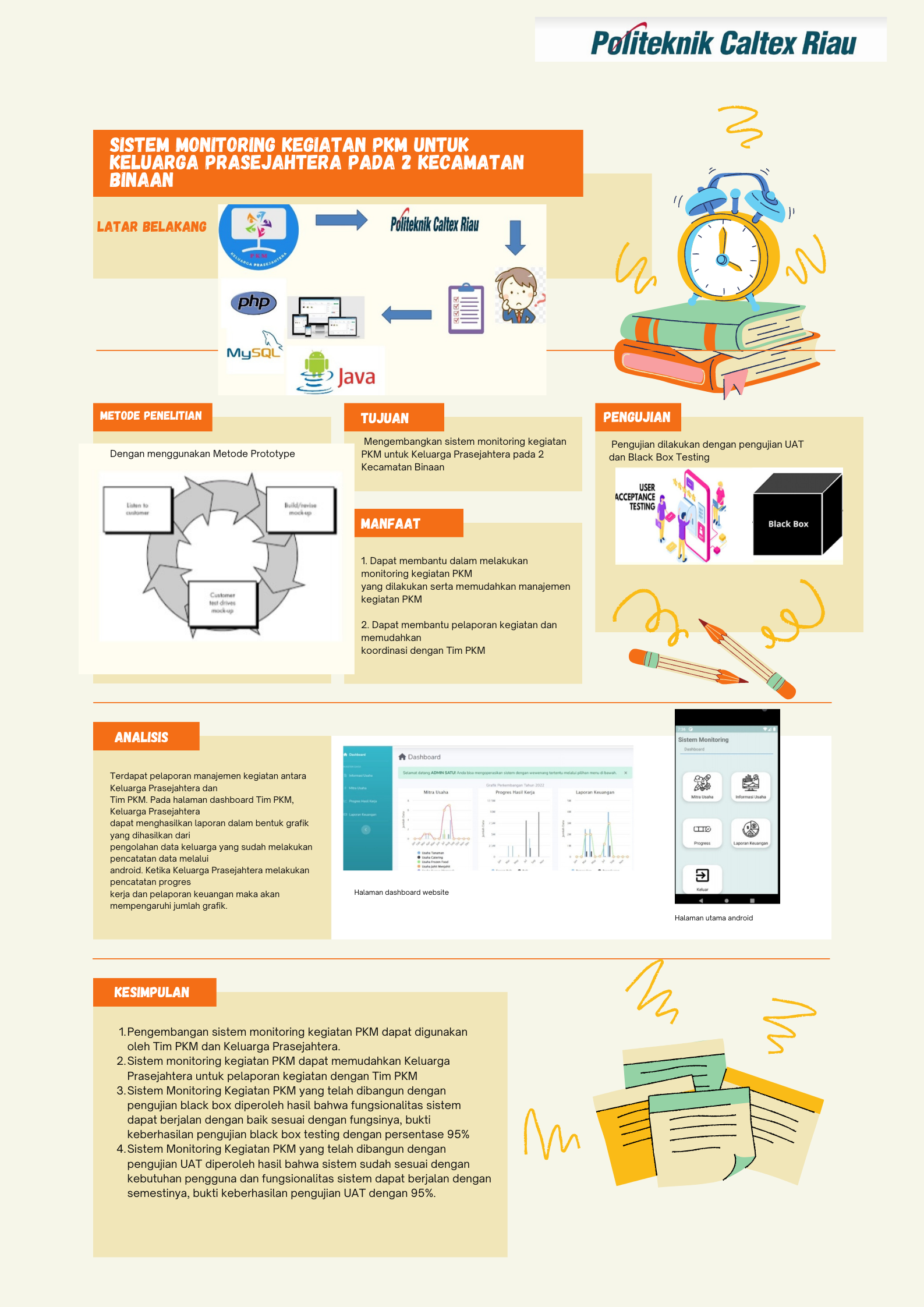Pengabdian Kepada Masyarakat (PKM) merupakan pelaksanaan pengamalan ilmu pengetahuan, teknologi dan seni budaya langsung pada masyarakat melalui metodologi ilmiah sebagai penyebaran Tri Dharma Perguruan Tinggi serta tanggung jawab dalam mengembangkan kemampuan masyarakat. Politeknik Caltex Riau merupakan salah satu Perguruan Tinggi Swasta yang menyelenggarakan kegiatan PKM. Jenis kegiatan PKM yang dilaksanakan terdiri atas 2 kategori yaitu jenis PKM yang dilaksanakan secara langsung dan kegiatan yang bersifat mono tahun dan multi tahun. Fokus dalam penelitian ini adalah kegiatan PKM yang bersifat mono tahun dan multi tahun. Permasalahan yang dihadapi saat ini adalah Tim PKM kesulitan dalam melakukan monitoring kegiatan. Studi kasus dari penelitian ini adalah monitoring. Dengan mempertimbangkan aspek kemudahan dalam berinteraksi maka dari sisi user dibangunlah sebuah platform berbasis mobile yang berjudul sistem monitoring kegiatan PKM untuk Keluarga Prasejahtera. Sistem ini dikembangkan dengan menggunakan bahasa pemrograman PHP, MySQL sebagai database dan bahasa pemrograman java untuk mobile. Selain itu, untuk mengembangkan sistem ini dengan menggunakan metode prototyping. Dengan dikembangkannya sistem ini, diharapkan dapat membantu Tim PKM untuk mempermudah dalam monitoring kegiatan, memudahkan dalam melakukan manajemen kegiatan PKM dengan Keluarga Prasejahtera dan begitu juga sebaliknya dengan Keluarga Prasejahtera. Sistem ini menggunakan pengujian UAT dan black box testing.