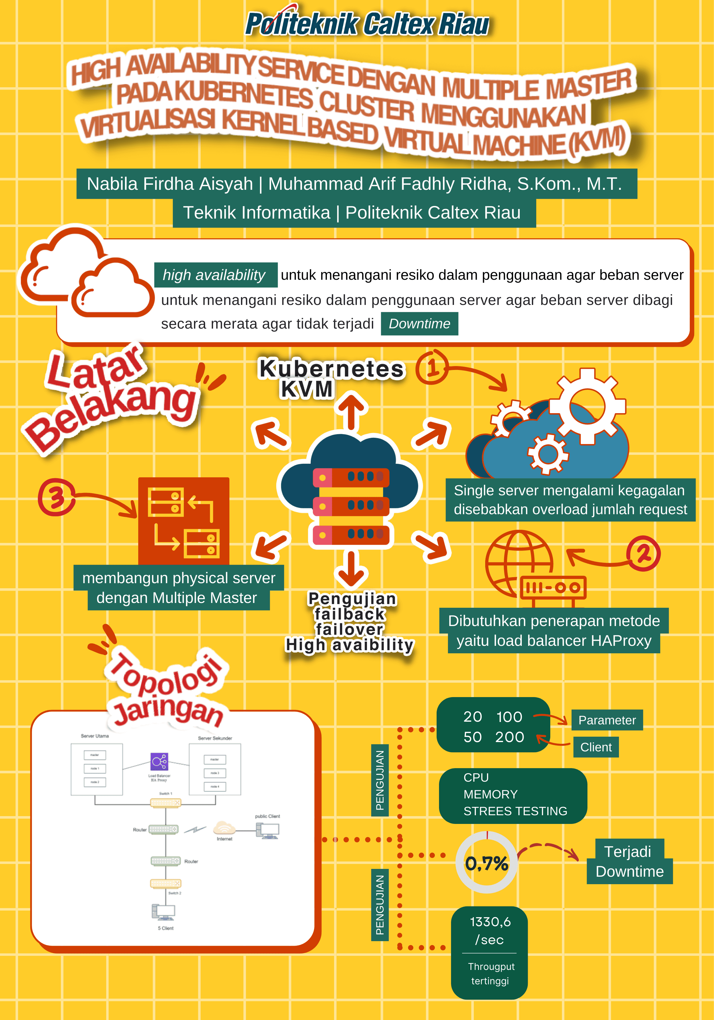 Server mempunyai peran penting dalam mengatur dan melayani permintaan dari client. Sehingga dibutuhkannya high availability untuk menangani resiko dalam penggunaan server. Dibutuhkanlah teknologi cluster, bertujuan agar beban server dibagi secara merata. Namun, untuk menjalankan clustering dibutuhkan penerapan metode yaitu load balancer HAProxy yang bekerja dengan mendistribusikan secara merata beban trafik ke physical server yang tercluster. Dengan menerapkan teknologi virtualisasi Kernel-Based Virtual Machine (KVM). Di dalam virtualisasi KVM ada teknologi yang digunakan yaitu Kubernetes. Dari hasil penelitian Proyek Akhir ini didapatkan hasil dari pengujian High Avaibility yang dilakukan diketahui bahwa kinerja server dengan skenario 5 percobaan akses 20-500 user dengan strees testing. Parameter yang diukur yaitu throughput serta sistem monitoring besar penggunaan CPU, memory sesuai dengan beban akses user. Yang mana nilai tertinggi dari Througput pada parameter 500 client senilai 1330,6/ sec. Dengan adanya 2 buah server memberikan hasil pengujian performance Dalam keadaan standby, pemakaian CPU dan pemakaian memory terendah terjadi pada server utama adalah 0,07% dan 24% karena tidak ada node-node yang berjalan di atas mesin virtual. Dalam keadaan busy, pemakaian CPU terendah terjadi pada server utama adalah 1,06% karena adanya pembagian beban kerja terhadap mesin virtual. Pemakaian memory terendah terjadi pada server server utama adalah 24 % karena tidak ada node-node yang berjalan di atas mesin virtual.