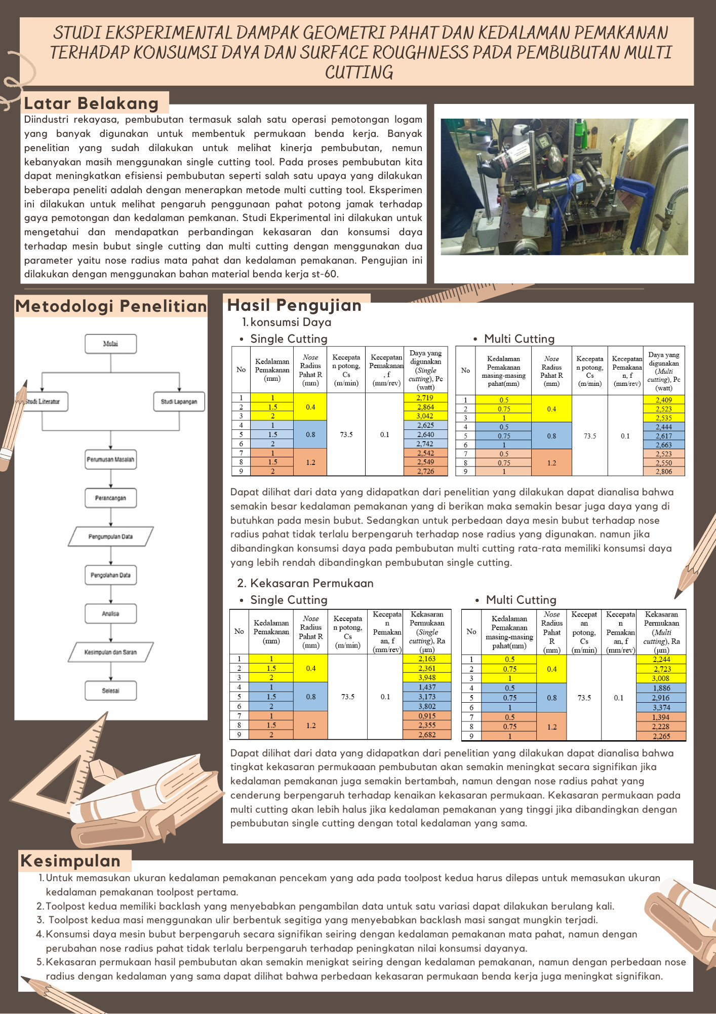 Studi Ekperimental ini dilakukan untuk mengetahui dan mendapatkan perbandingan kekasaran dan konsumsi daya terhadap mesin bubut single cutting dan multi cutting dengan menggunakan dua parameter yaitu nose radius mata pahat dengan variasi radius 0.4, 0.8, 1.2 dan kedalaman pemakanan dengan variasi kedalaman 1 mm, 1.5 mm dan 2 mm untuk single cutting dan 0.5 mm, 0.75 mm dan 1 mm untuk setiap pahat pada multi cutting. Pengujian ini dilakukan dengan menggunakan mesin bubut tipe kw-15486 dan bahan material benda kerja st-60. Berdasarkan data yang telah didapat konsumsi daya tertinggi pada pembubutan single cutting dengan nose radius mata pahat 0.4, kedalaman potong 2 mm, dengan kecepatan potong 73.5 m/min dan kecepatan pemakanan 0.1 mm/rev sebesar 3.04 kw sementara pada multi cutting dihasilkan daya tertinggi pada nose radius mata pahat 1.2, kedalaman potong 1 mm pada setiap pahat, dengan kecepatan potong 73.5 m/min dan kecepatan pemakanan 0.1 mm/rev didapat nilai dayanya 2.806 kw. Sedangkan kekasaran permukaan terbaik terdapat pada pembubutan single cutting dengan nilai 0.915 µm pada nose radius mata pahat 1.2, kedalaman potong 1 mm, dan nilai kekasaran permukaan terbaik pada pembubutan multi cutting sebesar 1.394 µm pada nose radius mata pahat 1.2, kedalaman potong 0.5 mm pada setiap pahat.