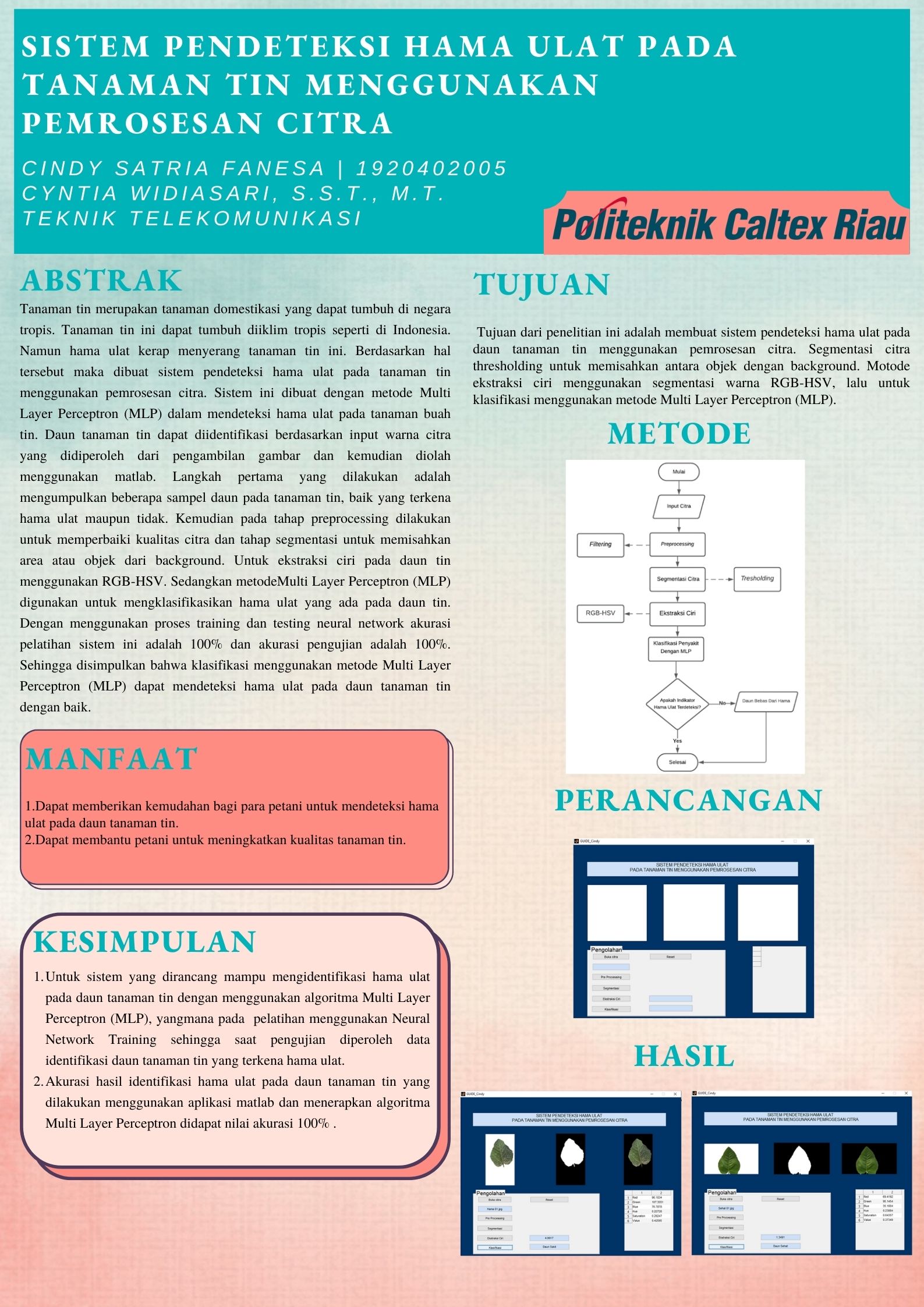 Tanaman tin merupakan tanaman domestikasi yang dapat tumbuh di negara tropis. Tanaman tin ini dapat tumbuh diiklim tropis seperti di Indonesia. Namun hama ulat kerap menyerang tanaman tin ini. Berdasarkan hal tersebut maka dibuat sistem pendeteksi hama ulat pada tanaman tin menggunakan pemrosesan citra. Sistem ini dibuat dengan metode Multi Layer Perceptron (MLP) dalam mendeteksi hama ulat pada tanaman buah tin. Daun tanaman tin dapat diidentifikasi berdasarkan input warna citra yang didiperoleh dari pengambilan gambar dan kemudian diolah menggunakan matlab. Langkah pertama yang dilakukan adalah mengumpulkan beberapa sampel daun pada tanaman tin, baik yang terkena hama ulat maupun tidak. Kemudian pada tahap preprocessing dilakukan untuk memperbaiki kualitas citra dan tahap segmentasi untuk memisahkan area atau objek dari background. Untuk ekstraksi ciri pada daun tin menggunakan RGB-HSV. Sedangkan metode Multi Layer Perceptron (MLP) digunakan untuk mengklasifikasikan hama ulat yang ada pada daun tin. Dengan menggunakan proses training dan testing neural network akurasi pelatihan sistem ini adalah 100% dan akurasi pengujian adalah 100%. Sehingga disimpulkan bahwa klasifikasi menggunakan metode Multi Layer Perceptron (MLP) dapat mendeteksi hama ulat pada daun tanaman tin dengan baik.