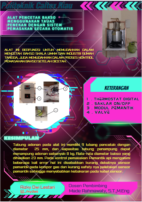 Bakso merupakan salah satu kuliner favorit yang banyak ditemukan di Indonesia. Proses pencetakan bakso di Indonesia masih banyak yang mencetak dengan cara manual yakni menggunakan tangan, maka dari itu diperlukan alat pencetak bakso yang dapat mencetak bakso dengan cepat. Para pengusaha bakso dapat memanfaatkan alat pencetak bakso agar produksi mereka lebih banyak dan berkualitas. Selain itu dari sisi waktu produksi yang lebih cepat juga menjadi alasan mereka menggunakan alat pencetak bakso. Alat yang akan dirancang menggunakan sistem pemasakan secara otomatis dan dua tuas sebagai tuas penekan dan tuas pencetak, dengan desain tabung yang memiliki 9 lubang pencetak dengan diameter 25 mm dan dapat menampung 8 kg adonan bakso. Cara kerja alat ini menggunakan pemotongan secara mekanik, yang mana tuas penekan menekan adonan di dalam tabung secara perlahan maka adonan bakso dapat keluar dari lubang-lubang tabung penampung adonan dan tuas pencetak memotong adonan yang keluar dari lubang-lubang tabung hingga seluruh adonan dapat dicetak dan masuk ke dandang perebusan. Bakso yang dihasilkan dari 1 kg adonan sebanyak 400 gram atau sekitar 27 butir per 20 detik. Suhu air pemasakan bakso hasil cetakan dikontrol oleh termostat digital, yang mana jika suhu