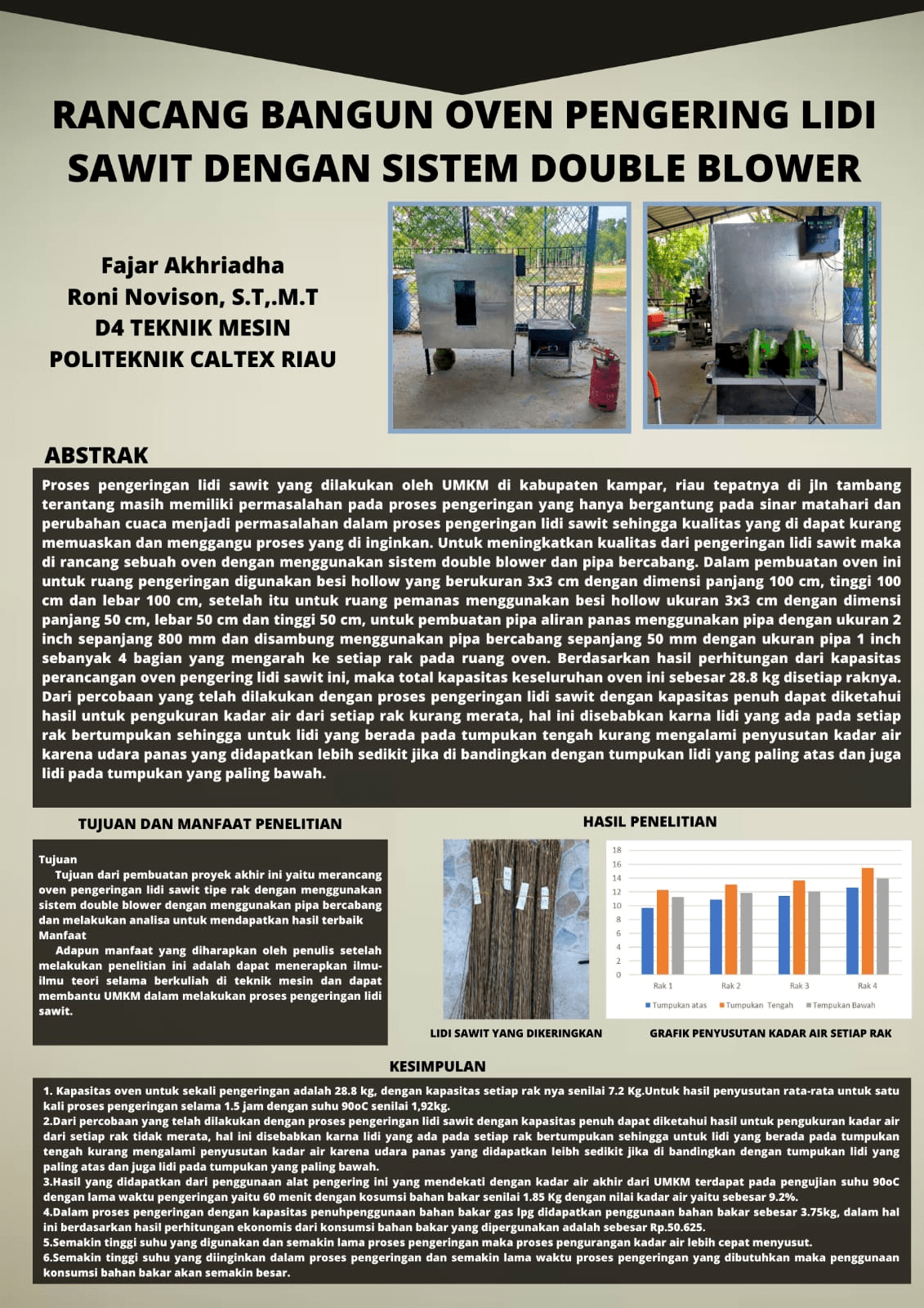 Proses pengeringan lidi sawit yang dilakukan oleh UMKM di kabupaten kampar, riau tepatnya di jln tambang terantang masih memiliki permasalahan pada proses pengeringan yang hanya bergantung pada sinar matahari dan perubahan cuaca menjadi permasalahan dalam proses pengeringan lidi sawit sehingga kualitas yang di dapat kurang memuaskan dan menggangu proses yang di inginkan. Untuk meningkatkan kualitas dari pengeringan lidi sawit maka di rancang sebuah oven dengan menggunakan sistem double blower dan pipa bercabang. Dalam pembuatan oven ini untuk ruang pengeringan digunakan besi hollow yang berukuran 3x3 cm dengan dimensi panjang 100 cm, tinggi 100 cm dan lebar 100 cm, setelah itu untuk ruang pemanas menggunakan besi hollow ukuran 3x3 cm dengan dimensi panjang 50 cm, lebar 50 cm dan tinggi 50 cm, untuk pembuatan pipa aliran panas menggunakan pipa dengan ukuran 2 inch sepanjang 800 mm dan disambung menggunakan pipa bercabang sepanjang 50 mm dengan ukuran pipa 1 inch sebanyak 4 bagian yang mengarah ke setiap rak pada ruang oven. Berdasarkan hasil perhitungan dari kapasitas perancangan oven pengering lidi sawit ini, maka total kapasitas keseluruhan oven ini sebesar 28.8 kg disetiap raknya. Dari percobaan yang telah dilakukan dengan proses pengeringan lidi sawit dengan kapasitas penuh dapat diketahui hasil untuk pengukuran kadar air dari setiap rak kurang merata, hal ini disebabkan karna lidi yang ada pada setiap rak bertumpukan sehingga untuk lidi yang berada pada tumpukan tengah kurang mengalami penyusutan kadar air karena udara panas yang didapatkan lebih sedikit jika di bandingkan dengan tumpukan lidi yang paling atas dan juga lidi pada tumpukan yang paling bawah.