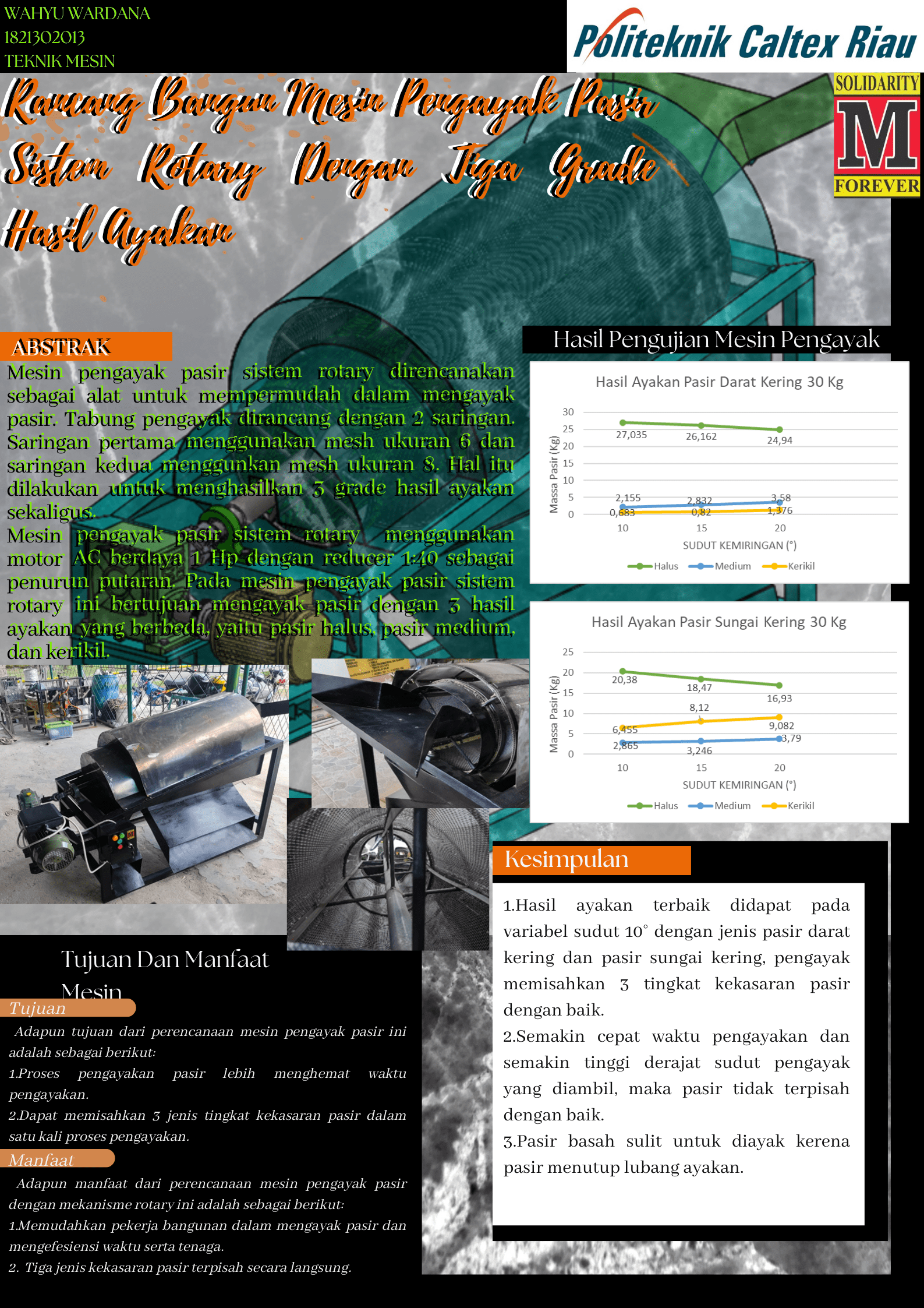 Mesin pengayak pasir sistem rotary direncanakan sebagai alat untuk mempermudah dalam mengayak pasir. Tabung pengayak dirancang dengan 2 saringan. Saringan pertama menggunakan mesh ukuran 6 dan saringan kedua menggunkan mesh ukuran 8. Hal itu dilakukan untuk menghasilkan 3 grade hasil ayakan sekaligus.