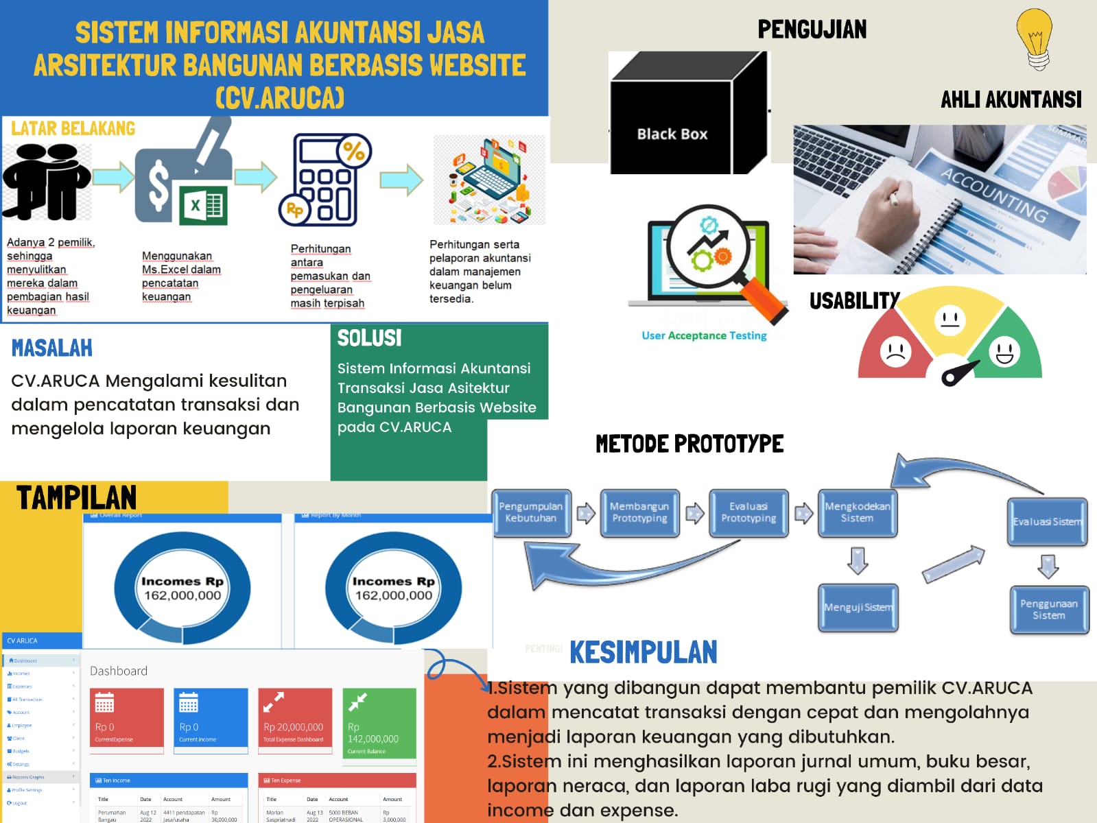 CV.ARUCA merupakan perusahaan yang bergerak dibidang jasa arsitektur yang berdasarkan layanan kualitas yang memeberikan pelayanan terbaik bagi pelanggan perusahaan. Berdasarkan hasil interview dengan pihak CV.ARUCA, setiap per enam bulan melakukan pencatatan keuangan secara manual menggunakan Microsoft excel. Selain itu perusahaan juga belum memiliki perhitungan terperinci serta pelaporan akuntansi dalam manajemen keuangan belum tersedia sehingga menyulitkan perusahaan dalam memantau perkembangan finansial perusahaan. Oleh karena itu, dibangunlah sebuah sistem yang dapat membantu pihak perusahaan dalam mencatat pendapatan, pengeluaran, serta menghasilkan suatu laporan keuangan. Sistem ini menggunakan bahasa pemrograman PHP dan MYSQL sebagai basis datanya. Dengan adanya sistem ini dapat membantu pihak perusahaan mencatat dan mengelola data transaksi. Sistem ini menggunakan pengujian user acceptance testing (UAT), blackbox testing dan divalidasi oleh ahli akuntansi untuk memastikan jurnal dan laporan keuangannya sudah benar. Dengan adanya Sistem Informasi Akuntansi ini akan membantu perusahaan untuk mengelola manajemen keuangan perusahaan sehingga dapat melihat hasil laporan transaksi-transaksi yang terjadi dalam perusahaan. Sistem ini menghasilkan laporan jurnal umum, buku besar, laporan neraca, dan laporan laba rugi yang diambil dari data income dan expense. Berdasarkan hasil pengujian User Acceptance Testing didapatkan hasil pengujian 100% untuk sistem ini sehingga sistem sudah sesuai dengan kebutuhan dari perusahaan. Dan pada pengujian Black Box Testing yang telah dilakukan didapatkan hasil 100% untuk fitur dan fungsional dari sistem sudah berjalan dengan baik. Begitu juga dengan pengujian Usability Testing didapatkan hasil 85,88% dengan begitu user sangat setuju dengan dibangunnya sistem Informasi Akuntanai Jasa Arsitektur Bangun Berbasis Website pada CV.ARUCA.