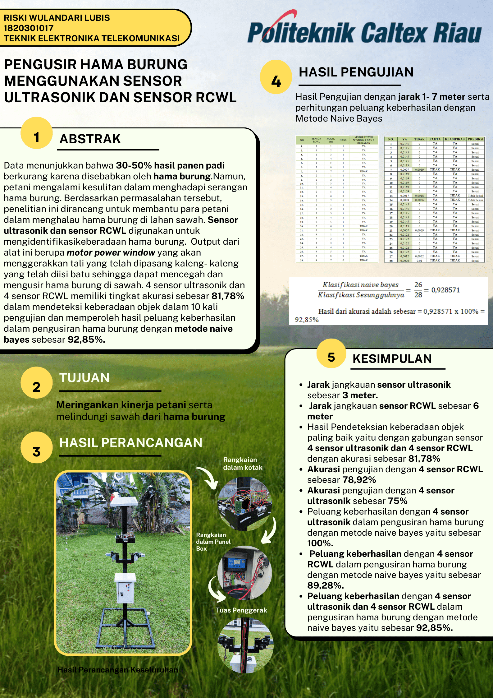 Data menunjukkan bahwa 30-50% hasil panen padi berkurang karena disebabkan oleh hama burung. Namun, petani mengalami kesulitan dalam menghadapi serangan hama burung. Dimana petani masih menunggui sawah selama fase pengisian bulir hingga panen. Berdasarkan permasalahan tersebut, penelitian ini dirancang untuk membantu para petani dalam menghalau hama burung di lahan sawah. Sensor ultrasonik dan sensor RCWL digunakan untuk mengidentifikasi keberadaan hama burung. Untuk dapat mempermudah proses mengidentifikasi keberadaan hama burung, di setiap sisi-sisi dari alat terdapat satu sensor ultrasonik dan satu sensor RCWL. Apabila kedua sensor tersebut mendeteksi keberadaan hama burung dalam jarak jangkauan sensor kemudian Arduino uno akan memproses data. Output dari alat ini berupa motor power window yang akan menggerakkan tali yang telah dipasang kaleng- kaleng yang telah diisi batu sehingga dapat mencegah dan mengusir hama burung di sawah. Setelah dilakukan pengujian , diperoleh bahwa 4 sensor ultrasonik dan 4 sensor RCWL memiliki tingkat akurasi sebesar 81,78% dalam mendeteksi keberadaan objek dalam 10 kali pengujian dan memperoleh hasil peluang keberhasilan dalam pengusiran hama burung dengan metode naive bayes sebesar 92,85%.