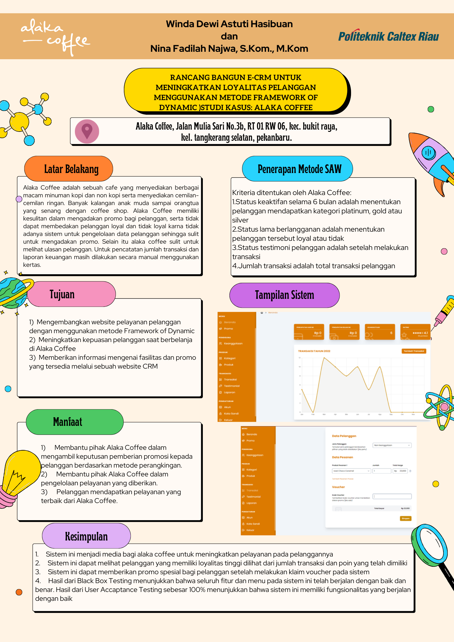 Alaka Coffee adalah sebuah cafe yang menyediakan berbagai macam minuman kopi dan non kopi serta menyediakan cemilan-cemilan ringan. Banyak kalangan anak muda sampai orangtua yang senang dengan coffee shop. Alaka Coffee memiliki kesulitan dalam mengadakan promo bagi pelanggan, serta tidak dapat membedakan pelanggan loyal dan tidak loyal karna tidak adanya sistem untuk pengelolaan data pelanggan sehingga sulit untuk mengadakan promo. Selain itu alaka coffee sulit untuk melihat ulasan pelanggan. Untuk pencatatan jumlah transaksi dan laporan keuangan masih dilakukan secara manual menggunakan kertas. Dari permasalahan diatas diperlukan sebuah sistem yang dapat membantu alaka coffee dalam melakukan penjualan dengan menggunakan sistem. Penelitian ini bertujuan untuk meningkatkan loyalitas pelanggan menggunakan metode framework of dynamic. Sistem ini dibangun menggunakan bahasa pemrograman PHP dan MySQL sebagai database. Dalam perancangannya sistem ini memanfaatkan metode Simple Additive Weighting. Proses perangkingan pelanggan melalui normalisasi suatu matriks keputusan. Hasil matriks keputusan yang diperoleh nilai tertinggi pelanggan berdasarkan kriteria adalah 1 dan terendah adalah 0.6. Pengujian yang telah dilakukan adalah pengujian blacbox testing didapatkan bahwa 100% fungsionalitas sistem berjalan dengan baik dan pengujian UAT, mendapatkan hasil bahwa semua fitur berjalan dengan baik dan dapat digunakan oleh super admin, admin dan pelanggan.