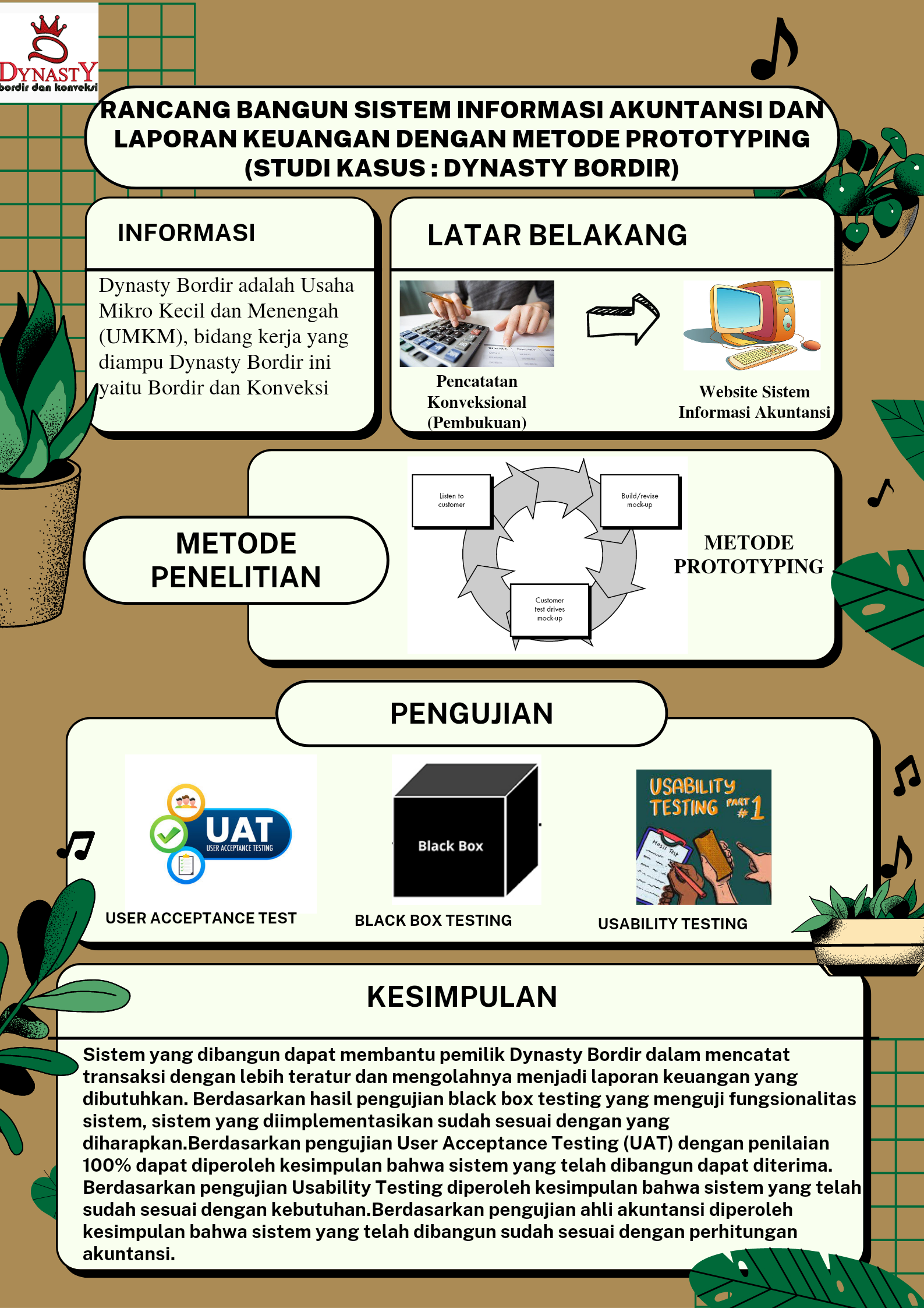 Dynasty Bordir merupakan salah satu bentuk badan usaha bisnis jasa bordir di Pekanbaru. Dynasty Bordir melakukan pencatatan laporan keuangan dengan teknik konvensional yaitu pencatatan menggunakan buku catatan untuk mengelola data keuangan. Apabila terjadi kesalahan maka akan berpengaruh kepada laporan keuangan secara keseluruan. Maka dari itu dibuatlah sistem informasi akuntansi berbasis website yang dapat melakukan rekap data dalam bentuk laporan akuntansi menggunakan metode prototyping. Berdasarkan hasil penelitian, sistem yang dibangun dapat membantu pemilik Dynasty Bordir dalam mencatat transaksi dengan lebih teratur dan mengolahnya menjadi laporan keuangan yang dibutuhkan. Dengan adanya fitur jurnal umum, buku besar, neraca saldo dan laba rugi dapat membantu pengguna dalam membuat laporan keuangan akuntansi perbulan. Hasil pengujian black box testing sudah sesuai dengan yang diharapkan. Hasil pengujian User Acceptance Testing (UAT) memperoleh nilai keberhasilan sistem 100%. Hasil pengujian Usability Testing sudah sesuai dengan kebutuhan.