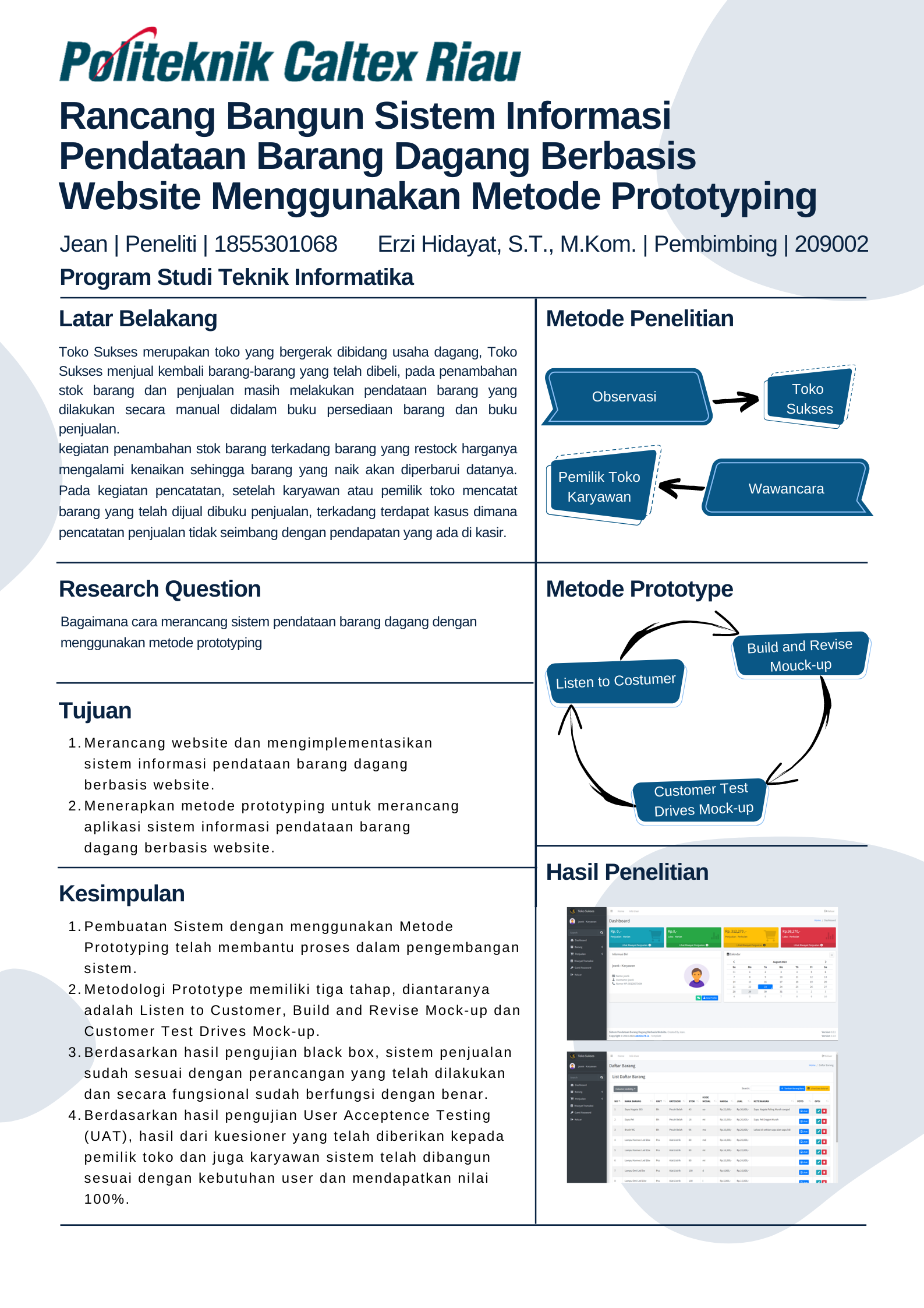 Toko Sukses merupakan toko yang bergerak dibidang usaha eceran yang meliputi kelontong, alat listrik dan bahan bangunan. Toko Sukses menjual kembali barang-barang yang telah dibeli melalui agen dan distributor, pada penambahan stok barang dan penjualan masih melakukan pendataan barang yang dilakukan secara manual didalam buku persediaan barang dan buku penjualan. kegiatan penambahan stok barang terkadang barang yang restock harganya mengalami kenaikan sehingga barang yang naik akan diperbarui datanya. Pada kegiatan pencatatan, setelah karyawan atau pemilik toko mencatat barang yang telah dijual dibuku penjualan, terkadang terdapat kasus dimana pencatatan penjualan tidak seimbang dengan pendapatan yang ada di kasir. Berdasarkan permasalahan diatas, maka penelitian ini mengusulkan untuk membuat sistem pendataan barang dengan judul Rancang Bangun Sistem Informasi Pendataan Barang Dagang Berbasis Website menggunakan Metode Prototyping. Sistem ini dirancang dengan menggunakan Bahasa pemrograman PHP dan MySQL sebagai basis datanya serta metode Prototyping sebagai pengembangannya. Pembangunan sistem dilakukan dengan 4 kali iterasi. Pengujian sistem ini dilakukan dengan menggunakan black box dengan hasil kesimpulan bahwa secara fungsional telah berhasil secara keseluruhan. Pengujian User Acceptance Test (UAT) yang dilakukan oleh pemilik toko dan karyawan, berdasarkan pengujian tersebut disimpulkan bahwa 4 aspek mendapatkan hasil 100% pengguna setuju dengan sistem ini dan juga mendapatkan beberapa saran masukan dari pengguna.