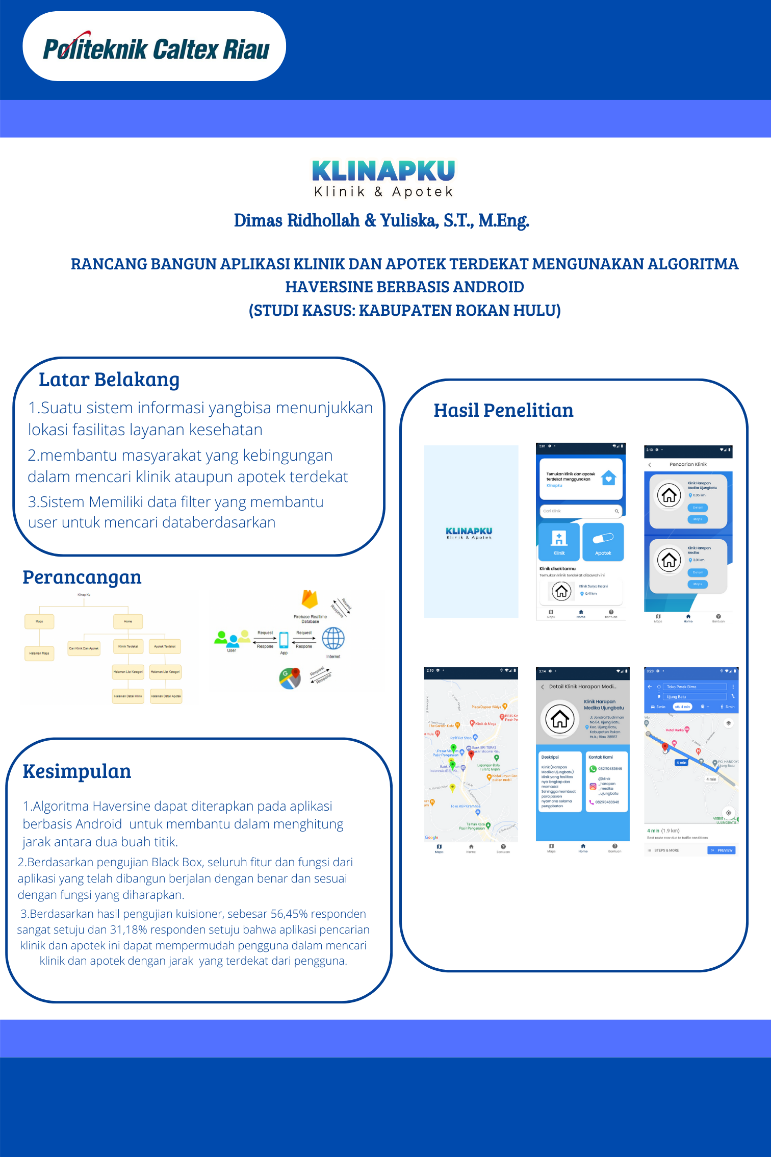 Informasi tentang klinik dan apotek di kabupaten rokan hulu masih begitu belum lengkap, informasi tersebut masih terpisah pada blog indivindu dan belum terintegrasi dalam suatu sistem informasi geografis, informasi mengenai klik dan apotek tersebut juga jarang ditemukan di situs-situs seperti Alodokter, HonestDocs dan lain sebagainya. Hal tersebut meyebabkan masyarakat dan khususnya masyarakat baru yang berada di kabupaten Rokan Hulu kesulitan mencari informasi tentang klinik dan apotik, sistem ini menggunakan Algoritama haversine untuk mencari titik terdekat dan berbasis Android, Aplikasi ini memanfaatkan layanan Google Maps API untuk menampilkan peta dan titik lokasi berdasarkan koordinat latitude dan longitude. Fitur navigasi menggunakan data yang berasal dari REST API. Berdasarkan pengujian black box yang telah dilakukan didapatkan hasil bahwa aplikasi sudah berjalan sesuai yang diharapkan. Setelah dilakukan pengujian kuesioner disimpulkan bahwa 56,45% setuju bahwa aplikasi pencarian klinik dan apotek ini dapat mempermudah pengguna dalam mencari klinik dan apotek dengan jarak yang terdekat dari pengguna.