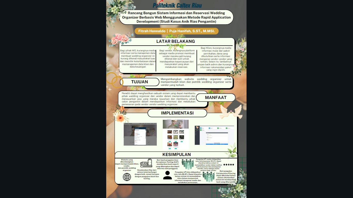 Anik Rias Pengantin merupakan wedding organizer yang berada di Kabupaten Rokan Hilir. Kurangnya media informasi serta manajemen data pada Wedding Organizer Anik Rias Pengantin membuat wedding organizer ini kurang dikenal masyarakat dan memiliki keterbatasan dalam memanajemen data klien dan vendor. Penelitian ini bertujuan untuk membangun sistem informasi dan reservasi Wedding Organizer Anik Rias Pengantin berbasis web untuk memudahkan WO dan vendor dalam mempromosikan jasanya dan penyediaan paket pernikahan yang dapat membantu klien dalam melakukan pemilihan paket yang disediakan. Maka dari itu, dibangunlah sebuah sistem informasi dan reservasi wedding organizer dengan menggunakan metodologi Rapid Application Development dalam pengembangannya dan sistem rekomendasi menggunakan metodologi Collaborative Filtering. Dari hasil pengujian User Acceptance Testing (UAT) yang telah dilakukan memberikan hasil seperti yang diharapkan dan dapat diterima oleh pengguna. Keseluruhan fitur dari sistem telah berfungsi dengan baik, sesuai harapan dengan pengujian black box testing. Dari hasil pengujian Usability Testing yang telah dilakukan kepada klien dan vendor, didapatkan rata-rata keseluruhan dari pernyataan kuesioner yaitu 86,8% dari klien dan 90,4% dari vendor. Dari hasil akhir tersebut, dapat dianalisa bahwa sistem informasi dan reservasi wedding organizer memudahkan klien dalam memperoleh informasi mengenai vendor dan melakukan pemesanan serta memudahkan vendor dalam melihat jadwal pesanan dan pendapatan mereka, serta sebagai media promosi bagi vendor. Dari hasil pengujian Collaborative Filtering, berdasarkan perhitungan nilai similiarity, nilai prediksi dan nilai MAE dapat diketahui bahwa sistem rekomendasi sistem ini mendapatkan hasil yang diharapkan.