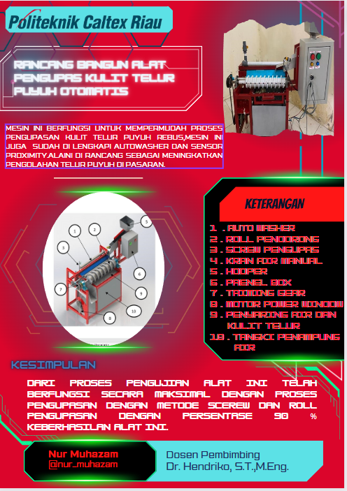 Telur puyuh merupakan salah satu jenis makanan yang paling banyak dikonsumsi oleh masyarakat Indonesia. Hal ini dikarenakan telur puyuh memiliki kandungan gizi dan manfaat yang cukup tinggi sehingga akan berdampak pada tingkat konsumsi yang semakin besar. Telur puyuh memiliki ukuran yang sangat kecil dibandingkan dengan telur unggas lainnya. Untuk itu diperlukan teknologi yang dapat digunakan untuk mengupas cangkang telur tersebut agar teksturnya tidak rusak. Salah satunya dengan menggunakan alat pengupas telur puyuh yang sudah direbus. Dalam perencangan alat pengupas kulit telur puyuh otomatis penulis menggunakan screew pengupas sebagai roll mekanik pengupas pada telur puyuh, alat ini juga di lengkapi sistem autowasher yang berfungsi sebagai pencuci telur sekaligus membantu proses pengupasan. perencangan alat pengupas kulit telur puyuh otomatis juga memperhitungkan perencanaan daya motor dc, perancangan sistem mekanis pada alat, memperhitungkan taiming gear, dan diameter Poros roll. Perhitungan rpm juga turut di perhitungkan dalam perancangan alat yang mempengaruhi dari tingkat keberhasilannya terkupas kulit erta efesiensi dari alat untuk di gunakan. Alat ini dapat memudahkan industri rumahan yang tekusus di bidang pengolahan telur puyuh dalam proses pengupasan kulit telur puyuh. Dari pengujian di dapatkan alat pengupas kulit telur puyuh otomatis rpm motor dc yang baik buat pengupasan iyalah kecepatan motor 85,2 rpm dengan lama waktu pengupasan 7 detik.