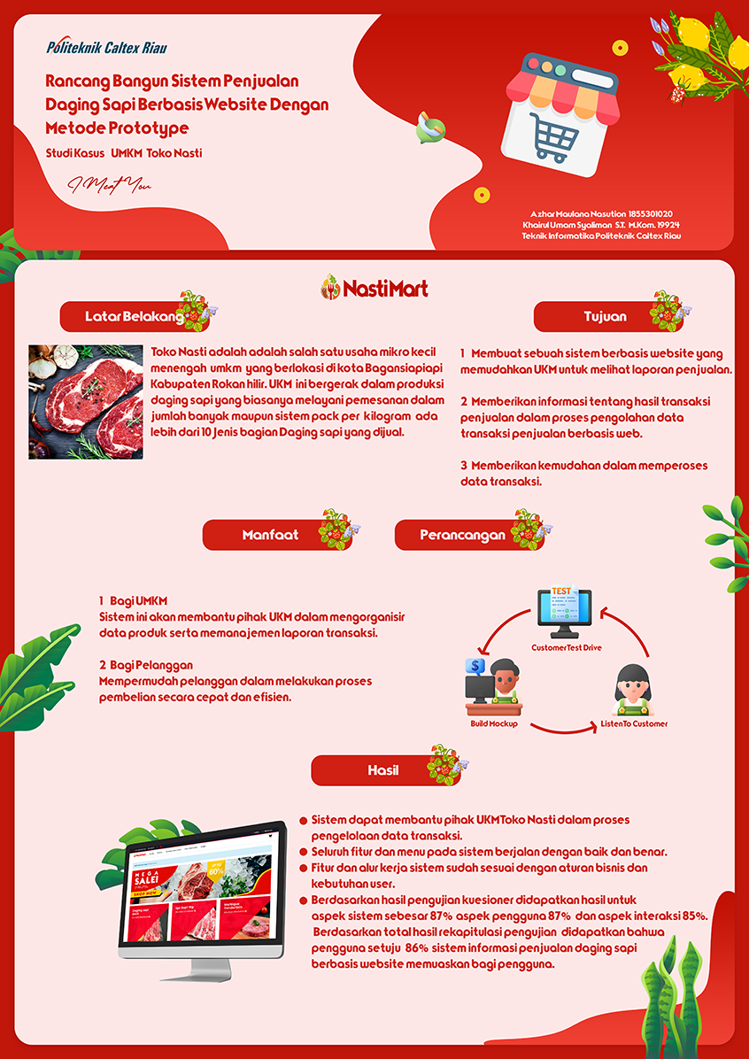 Usaha Mikro Kecil Menengah (UMKM) Toko Nasti merupakan suatu usaha umkm yang bergerak di bidang penjualan dengan fokus penjualan daging sapi. Permasalahan yang dihadapi dalam pelaksanaan program ini adalah pengelolaan data yang dilakukan masih secara manual, seperti melakukan penyimpanan, pengolahan, dan perhitungan hasil keuntungan pada buku catatan, sehingga membutuhkan waktu yang lama dalam mengolah dan mendapatkan suatu informasi serta tingginya resiko terjadinya kehilangan data. Permasalahan kedua yang menjadi point penting yaitu pemasaran ruang lingkup produk yang masih kecil, dan promosi masih dilakukan dengan cara mulut-kemulut maupun dengan flayer desain yang kurang efektif. Dari permasalahan tersebut maka akan dibangun “Website Toko Onlineâ€. Sistem informasi ini akan di kembangkan menggunakan metode Prototype. Menggunakan pengujian black box testing dan kuesioner. Dengan sistem informasi ini diharapkan dapat membantu UKM Toko Nasti dalam pengembangan usaha. Pengembangan sistem ini diselesaikan pada 2 iterasi dan pengerjaan sistem selama lebih kurang 4 bulan. Berdasarkan hasil pengujian blackbox dapat disimpulkan bahwa secara fungsionalitas sistem telah berhasil. Sedangkan berdasarkan pengujian kuesioner didapatkan bahwa pengguna 86,97% sistem ini memuaskan bagi pengguna. Sistem yang dibangun dapat membantu pihak toko nasti dalam pengelolaan data transaksi penjualan