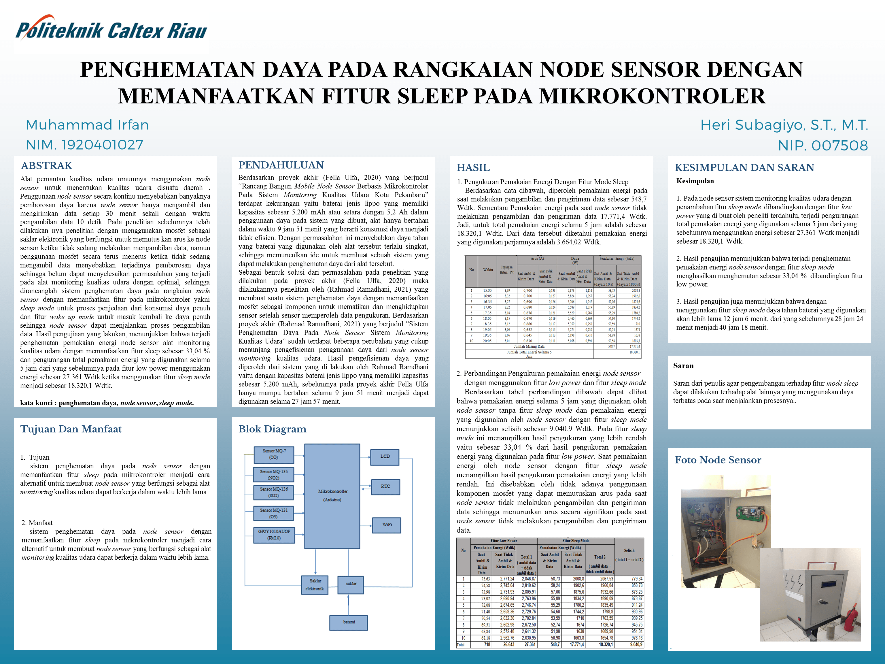 Alat pemantau kualitas udara menggunakan node sensor untuk menentukan kualitas udara disuatu daerah . Penggunaan node sensor kontinu menyebabkan banyaknya pemborosan daya karena node sensor mengambil dan mengirimkan data setiap 30 menit sekali dengan waktu pengambilan data 10 detik. Pada penelitian sebelumnya dilakukan nya penelitian dengan menggunakan mosfet sebagai saklar elektronik yang berfungsi untuk memutuskan arus ke node sensor ketika tidak sedang melakukan mengambilan data, namun penggunaan mosfet secara terus menerus ketika tidak sedang mengambil data menyebabkan terjadinya pemborosan daya sehingga belum dapat menyelesaikan permasalahan yang terjadi pada alat monitoring kualitas udara dengan optimal, sehingga dirancanglah sistem penghematan daya pada rangkaian node sensor dengan memanfaatkan fitur pada mikrokontroler yakni sleep mode untuk proses penjedaan dari konsumsi daya penuh dan fitur wake up mode untuk masuk kembali ke daya penuh sehingga node sensor dapat menjalankan proses pengambilan data. Hasil pengujiaan yang lakukan, menunjukkan bahwa terjadi penghematan pemakaian energi node sensor alat monitoring kualitas udara dengan memanfaatkan fitur sleep sebesar 33,04 % dan pengurangan total pemakaian energi yang digunakan selama 5 jam dari yang sebelumnya pada fitur low power menggunakan energi sebesar 27.361 Wdtk ketika menggunakan fitur sleep mode menjadi sebesar 18.320,1 Wdtk.