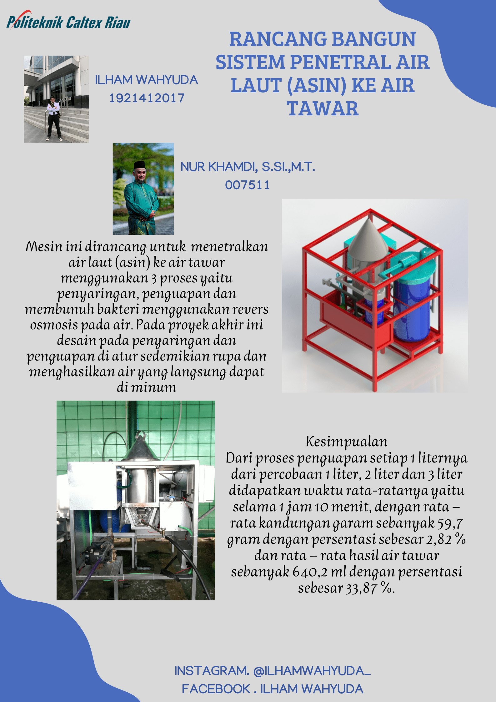 Air laut merupakan air yang mengandung banyak garam dan memiliki intensitas air yang sangat tinggi dan memiliki rasa yang sangat asin, untuk mendapatkan air yang bisa diminum oleh manusia air laut harus di sterilkan salah satunya dengan cara menguapkan air laut dengan suhu maksimal 105 celcius. Untuk mesin yang dibuat menggunakan 3 proses yaitu penyaringan, penguapan dan membunuh bakteri menggunakan revers osmosis pada air. Pada saat diuap maksimal daya tampung air hanya 5 liter di dalam tabung pengupan untuk menghasilkan air yang dapat diminum setidaknya 68 menit untuk mengasilkan air 400 ml, untuk saat ini mesin masih banyak kekurangan dan perlu inovasi yang lebih baik dan bisa menghasilkan air yang lebih banyak dan waktu yang dibutuhkan lebih cepat. Pada proyek akhir ini desain pada penyaringan dan penguapan di atur sedemikian rupa dan menghasilkan air yang langsung dapat di minum. Secara umum cara kerja pada mesin ini dimulai dengan cara menyaring air laut menggunakan media filter lalu masuk dalam penguapan dengan dipanaskan 95 sampai 105 celcius lalu setelah air uap sudah di dapatkan. Air laut di saring menggunakan membran RO dan ultra violet agar air dapat dikonsumsi, dan mesin ini menghasilkan waktu yang dibutuhkan dalam proses penguapan setiap 1 liternya dari percobaan 1 liter, 2 liter dan 3 liter didapatkan waktu rata-ratanya yaitu selama 1 jam 10 menit, dengan rata – rata kandungan garam sebanyak 59,7 gram dengan persentasi sebesar 2,82 % dan rata – rata hasil air tawar sebanyak 640,2 ml dengan persentasi sebesar 33,87 %.