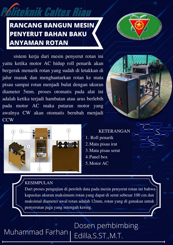 Rotan Merupakan Salah Satu Tanaman Yang Banyak Tumbuh Di Indonesia,Salah Satu Daerah Yang Termasuk Penghasil Rotan Yang Banyak Adalah Riau. Rotan Adalah Tanaman Yang Menjadi Salah Satu Bahan Baku Dalam Kerajinan Tangan Maupun Industri Mebel,Oleh Karena Itu, Untuk Memanfaatkan Dari Banyaknya Tanaman Rotan Ini Bisa Dijadikan Suatu Barang Yang Bermanfaat Seperti Meja,Kursi Dan Kerajinan Tangan Lainnya. Proses Pembuatan Kerajinan Rotan Dilakukan Dengan Beberapa Tahapan Mulai Dari Membelah Rotan Menjadi Beberapa Bagian, Kemudian Penyerutan Rotan Menjadi Rotan Yang Siap Di Anyam. Proses Kegiatan Ini Masih Dilakukan Dengan Alat Bantu Pisau, Sehingga Memakan Waktu Yang Lama Dalam Proses Penyerutannya. Maka Dari Itu Diperlukan Suatu Mesin Untuk Mempermudah Dalam Proses Penyerutan Rotan Untuk Bahan Baku Anyaman. Mesin Yang Dirancang Menggunakan Tenaga Penggerak Menggunakan Motor Listrik 1 HP Dengan Putaran 2200 Rpm Type Low Dimensi Mesin Dengan Panjang 65 Cm X Lebar 35 Cm, Kerangka Mesin Menggunakan Besi Siku Dengan Ketebalan 2 Mm. Dengan adanya mesin ini di harapkan penyerutan rotan akan lebih efektif dan efesien.