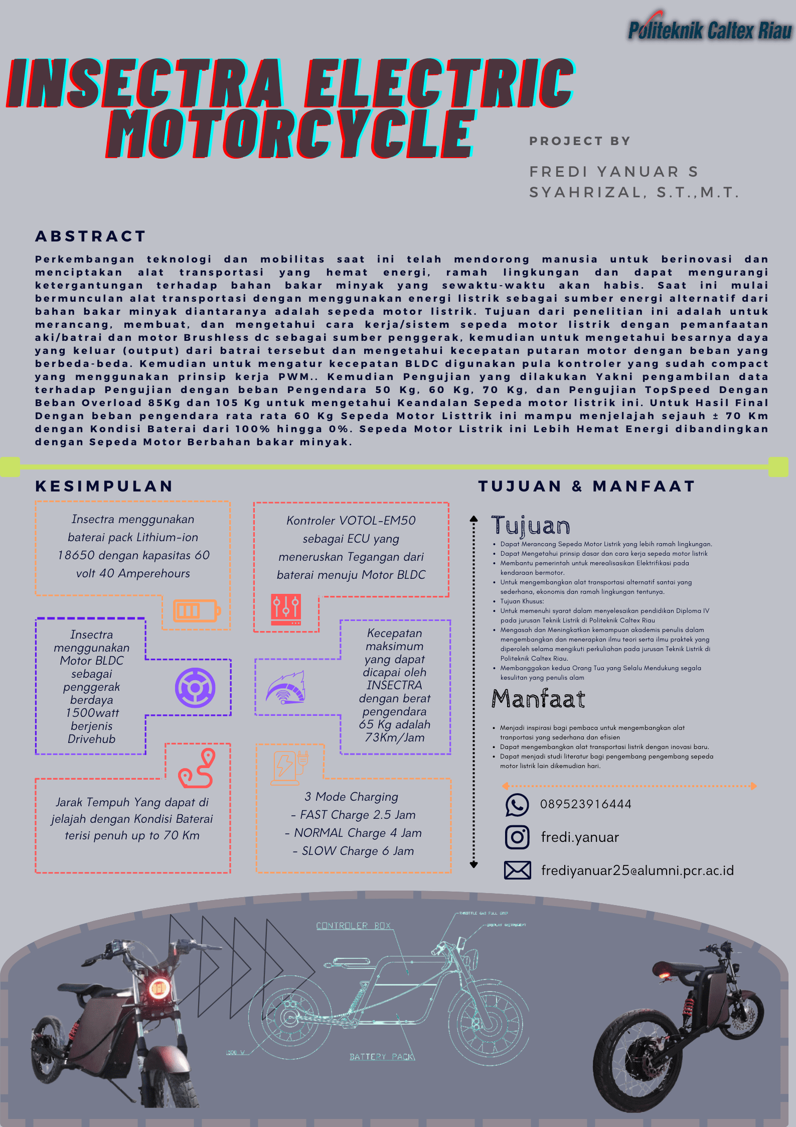 Perkembangan teknologi dan mobilitas saat ini telah mendorong manusia untuk berinovasi dan menciptakan alat transportasi yang hemat energi, ramah lingkungan dan dapat mengurangi ketergantungan terhadap bahan bakar minyak yang sewaktu-waktu akan habis. Saat ini mulai bermunculan alat transportasi dengan menggunakan energi listrik sebagai sumber energi alternatif dari bahan bakar minyak diantaranya adalah sepeda motor listrik. Tujuan dari penelitian ini adalah untuk merancang, membuat, dan mengetahui cara kerja/sistem sepeda motor listrik dengan pemanfaatan aki/batrai dan motor Brushless dc sebagai sumber penggerak, kemudian untuk mengetahui besarnya daya yang keluar (output) dari batrai tersebut dan mengetahui kecepatan putaran motor dengan beban yang berbeda-beda. Kemudian untuk mengatur kecepatan BLDC digunakan pula kontroler yang sudah compact yang menggunakan prinsip kerja PWM.. Kemudian Pengujian yang dilakukan Yakni pengambilan data terhadap Pengujian dengan beban Pengendara 50 Kg, 60 Kg, 70 Kg, dan Pengujian TopSpeed Dengan Beban Overload 85Kg dan 105 Kg untuk mengetahui Keandalan Sepeda motor listrik ini. Untuk Hasil Final Dengan beban pengendara rata rata 60 Kg Sepeda Motor Listtrik ini mampu menjelajah sejauh ± 70 Km dengan Kondisi Baterai dari 100% hingga 0%. Sepeda Motor Listrik ini Lebih Hemat Energi dibandingkan dengan Sepeda Motor Berbahan bakar minyak.