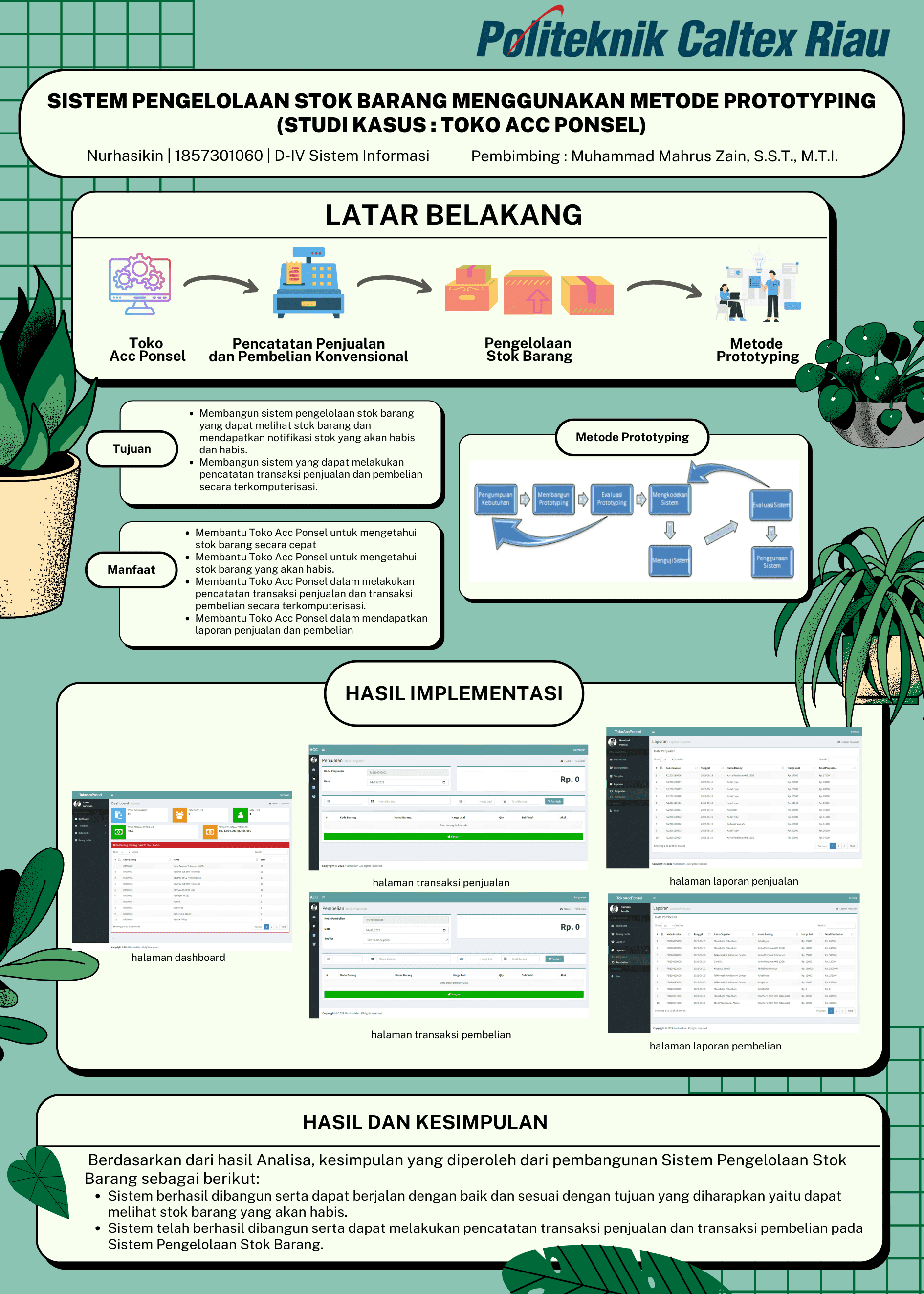 Toko Acc Ponsel berlokasi di Jalan Lintas Timur, Simpang Empat Belilas No. Kelurahan, Pangkalan Kasai, Seberida, Kabupaten Indragiri Hulu, Riau 29371. Toko ACC Ponsel masih menggunakan Teknik konvensional yaitu pencatatan menggunakan buku catatan untuk mengelola data penjualan, data pembelian, data stok barang. Apabila dilakukan pencatatan secara konvensional maka akan menyebabkan beberapa masalah yaitu data penjualan, pembelian dan barang rusak dan hilang. Maka dari itu, dibuatlah sistem pengelola stok barang menggunakan metode prototyping. Observasi, wawancara dan studi pustaka dilakukan untuk pengumpulan data. Rancangan sistem pengelolaan stok barang menyediakan dua level akses, yaitu pemilik toko dan karyawan. Pemilik toko mengelola data pengguna, data salesman, mengelola data pemasok, mengakses data barang yang akan habis, mengakses laporan stok barang, laporan penjualan dan laporan pembelian. Dengan dikembangkan sistem ini diharapkan dapat membantu toko dalam melakukan pencatatan transaksi penjualan, transaksi pembelian dan pencatatan stok barang secara terkomputerisasi. Metode pengembangan sistem yang digunakan adalah metode prototyping dan telah berhasil diimplementasikan dari tahapan pengembangan diketahui bahwa pengguna dan pengembang sistem telah mencapai kesepakatan pada iterasi ke-2. Berikut pengujian yang telah dilakukan, yaitu blackbox dan usability testing. Black Box testing disimpulkan dari 27 butir uji fungsional sistem sudah dapat berjalan dengan baik. Dan berdasarkan dari usability testing dilakukan pengujian menggunakan wawancara, pengguna mengalami sedikit kesulitan dalam menggunakan sistem tetapi sistem dapat beroperasi dengan baik