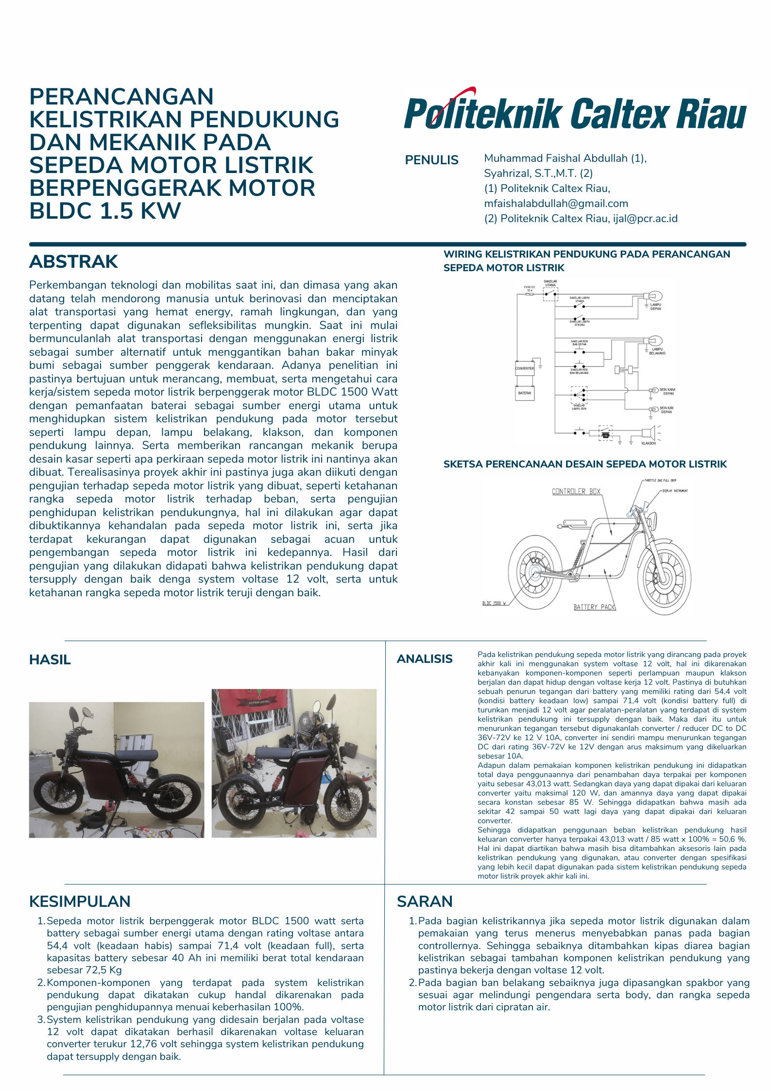 Perancangan Kelistrikan Pendukung dan Mekanik Pada Sepeda Motor Listrik Berpenggerak Motor BLDC 1.5 kW