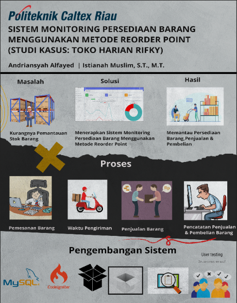 Toko Harian Rifky adalah toko yang menjual barang harian atau sembako yang sudah berdiri kurang lebih 7 tahun. Toko Harian Rifky ini masih melakukan pengolahan data transaksi penjualan dan pembelian masih dilakukan secara manual, dengan menyimpan bon barang yang telah dibeli dan tidak menggunakan buku untuk mencatat semua proses bisnis yang terjadi. Akibat kelebihan dan kekurangan barang dalam penentuan jumlah pembelian pada supplier. Berdasarkan permasalahan yang ada maka dibangun Sistem Monitoring Persediaan Barang untuk mendukung kegiatan bisnis dari Toko Harian Rifky. Sistem Monitoring Persediaan Barang ini dibangun dengan menggunakan metode Reorder Point yang dapat menentukan batas stok barang yang ada di toko. Kemudian untuk lot sizing menggunakan metode Economic Order Quantity untuk mengatasi masalah persediaan barang yang menumpuk sehingga, pemesanan barang bisa berjalan dengan baik. Sistem ini dibangun dengan menggunakan bahasa pemrograman Hypertext Preprocessor (PHP) dan MySQL sebagai basis datanya. Sistem menggunakan pengujian Black Box Testing, Whitebox Testing, User Acceptance Testing (UAT) dan Usability Testing. Hasil dari penelitian ini adalah sistem dapat membantu Toko Harian Rifky dalam monitoring persediaan barang, pengorderan kembali sesuai dengan kebutuhan toko dengan menggunakan metode ROP (Reorder Point), pencatatan transaksi penjualan, pembelian, dan pencatatan stok barang sehingga mengurangi resiko terjadinya kesalahan, pengujian white box dari cyclomatic compexity adalah V(G) : 1, dimana V(G) merupakan cyclomatic compexity. dan user acceptance testing yang dilakukan, sistem dapat berfungsi dengan baik sesuai dengan kebutuhan pada Toko Harian Rifky.