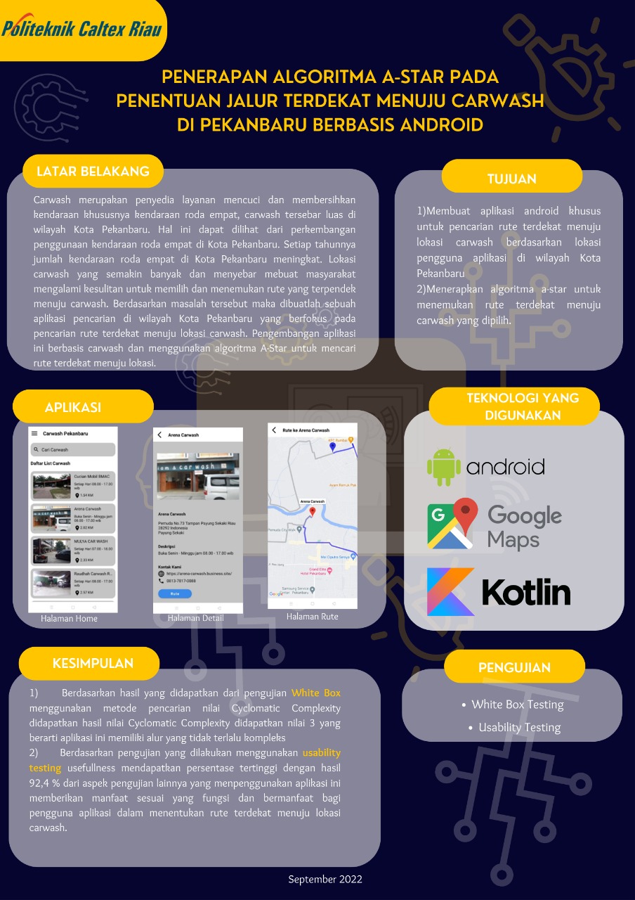 Carwash merupakan penyedia layanan mencuci dan membersihkan kendaraan khususnya kendaraan roda empat, carwash tersebar luas di wilayah Kota Pekanbaru. Hal ini dapat dilihat dari perkembangan penggunaan kendaraan roda empat di Kota Pekanbaru. Setiap tahunnya jumlah kendaraan roda empat di Kota Pekanbaru meningkat. Lokasi carwash yang semakin banyak dan menyebar membuat masyarakat mengalami kesulitan untuk memilih dan menemukan rute yang terpendek menuju carwash. Berdasarkan masalah tersebut maka dibuatlah sebuah aplikasi pencarian di wilayah Kota Pekanbaru yang berfokus pada pencarian rute terdekat menuju lokasi carwash. Pengembangan aplikasi ini berbasis carwash dan menggunakan algoritma A-Star untuk mencari rute terdekat menuju lokasi. Aplikasi ini memanfaatkan Google Maps API untuk menampilkan peta lokasi dan titik lokasi berdasarkan titik koordinat, sedangkan untuk data titik lokasi carwash serta informasi detail berasal dari data di REST API. Pengembangan aplikasi ini diharapkan dapat membantu pengguna dalam menemukan rute terdekat menuju lokasi carwash. Berdasarkan hasil pengujian yang telah dilakukan menggunakan white box didapatkan nilai kompleksitas 3 yang berarti aplikasi ini tidak terlalu kompleks. Selanjutnya pengujian dilakukan menggunakan Usability testing di mana aspek usefulness mendapatkan persentase tertinggi dengan hasil 92,4 % dari aspek pengujian lainnya yang mempergunakan aplikasi ini memberikan manfaat sesuai yang fungsi dan bermanfaat bagi pengguna aplikasi dalam menentukan rute terdekat menuju lokasi carwash.