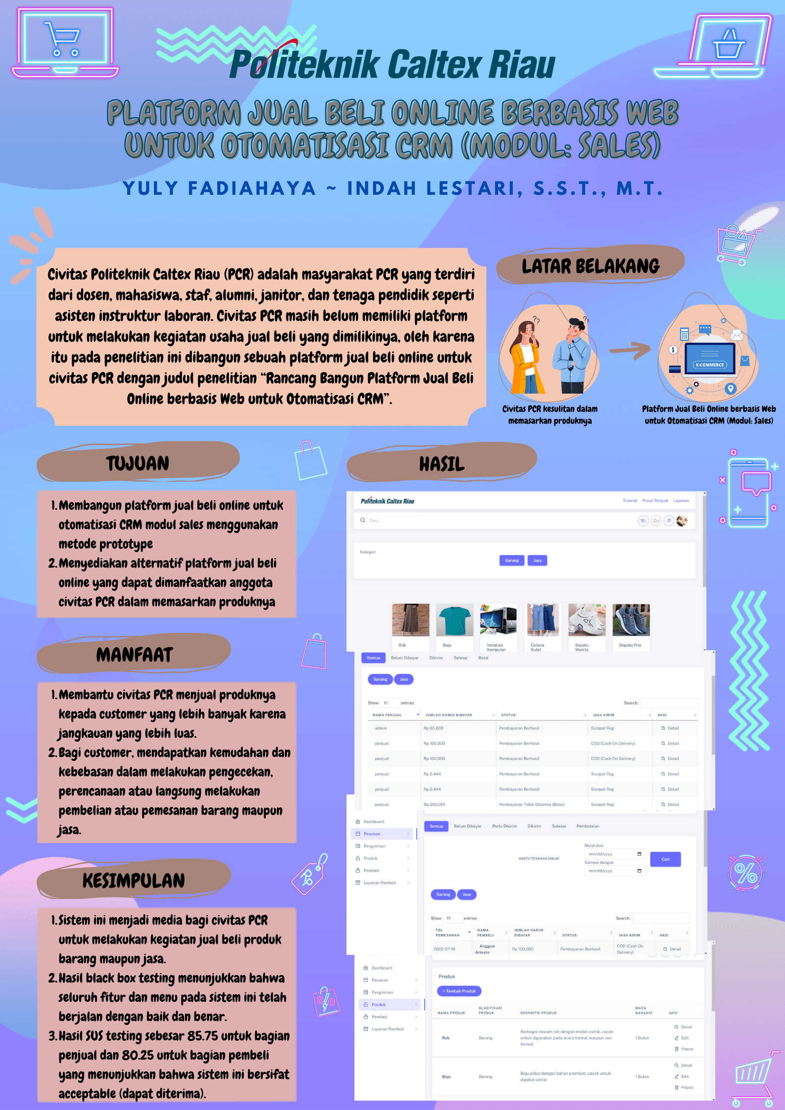 Civitas Politeknik Caltex Riau (PCR) adalah masyarakat PCR yang terdiri dari dosen, mahasiswa, staf, alumni, janitor, dan tenaga pendidik seperti asisten instruktur laboran. Civitas PCR masih belum memiliki platform untuk melakukan kegiatan usaha jual beli yang dimilikinya, oleh karena itu pada penelitian ini dibangun sebuah platform jual beli online untuk civitas PCR dengan judul penelitian “Rancang Bangun Platform Jual Beli Online berbasis Web untuk Otomatisasi CRMâ€. Dengan adanya platform jual beli online ini diharapkan dapat menjadi alternatif bagi civitas PCR dalam melakukan penjualan dan pemasaran produk serta pelayanan pelanggan. Sistem ini dibangun menggunakan PHP (Hypertext Processor) sebagai bahasa pemrograman dan MySQL sebagai database. Kebutuhan klien diidentifikasi dengan memperhatikan voice of customer (VOC). Voice of customer adalah level pertama pada metodologi Quality Function Deployment (QFD) dimana kebutuhan riil pengguna benar-benar dipertanyakan dan memiliki tingkat keandalan tertentu. Pengembangan sistem dilakukan dengan menggunakan metode prototyping dalam 3 kali iterasi. Hasil dari iterasi prototyping telah diimplementasikan dengan baik dalam pembangunan sistem. Hasil pengujian black box testing menyatakan bahwa sistem berjalan dengan baik. Hasil pengujian usability dengan metode SUS Testing menghasilkan total nilai skor SUS sebesar 85.75 untuk sistem bagian penjual dan 80.25 untuk sistem bagian pembeli, hasil ini menunjukkan bahwa sistem bersifat acceptable dan diterima oleh civitas PCR.