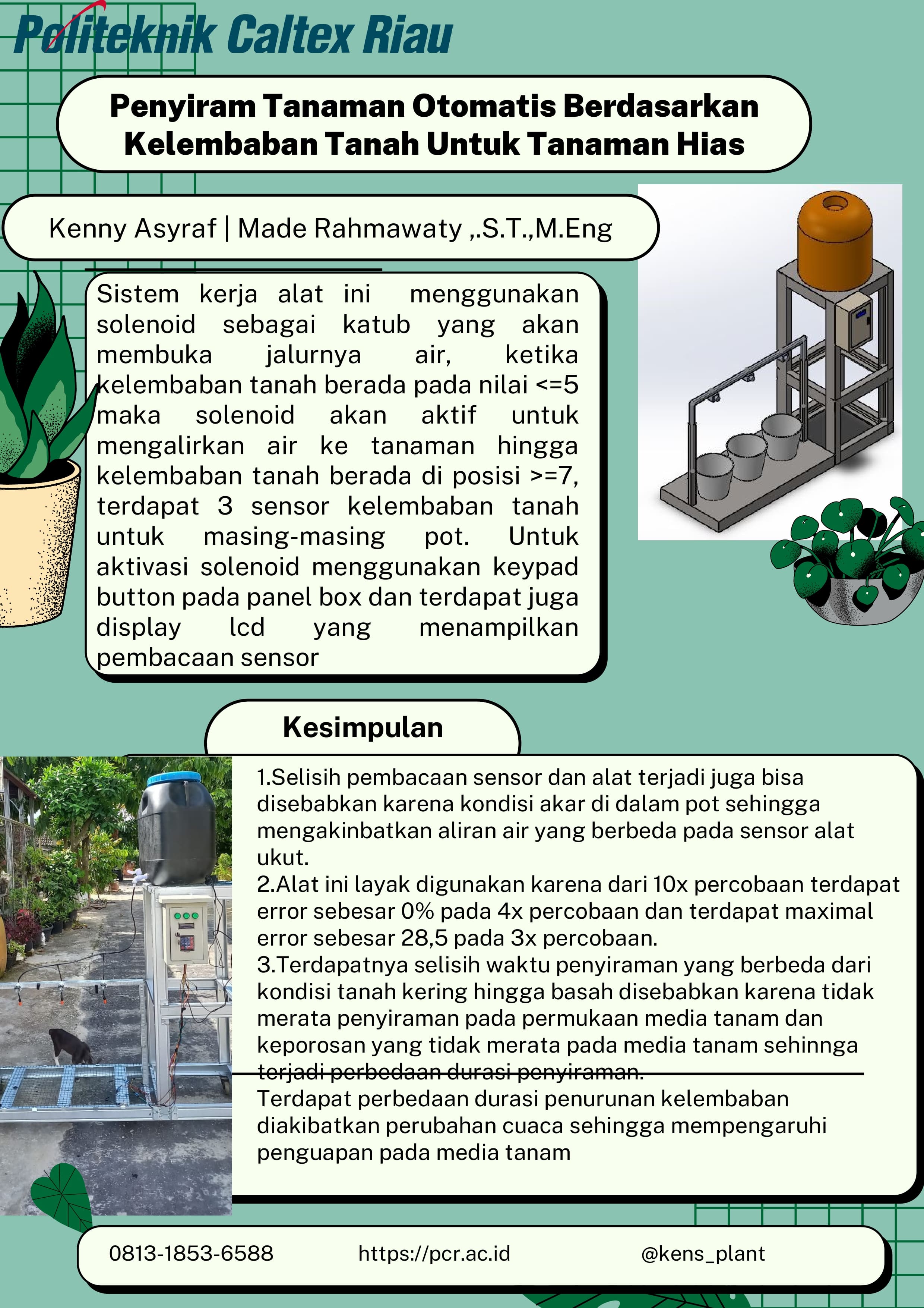 Menyiram tanaman menjadi sebuah kegiatan wajib dalam perkebunan dan pertanian. Banyak faktor yang menjadi permasalahan pada saat penyiraman tanaman,seperti tidak efesiensi nya dan efektifnya penyiraman terhadap kekeringan tanah dan tidak ratanya penyiraman yang dilakukan. Penyiraman secara manual membutuhkan biaya yang cukup besar dan tingkat keefektifan yang rentan jika digunakan untuk skala besar. Adapun proyek akhir ini menggunakan sensor kelembaban tanah yang membaca kelembaban tanah di dalam pot tanaman hias. Apabila kondisi tanah atau media tanam kering, maka sistem secara otomatis akan menyiram tanaman dan berhenti hingga kelembaban yang diinginkan sudah tercapai. Terdapat 3 sensor yang diletakkan pada pot yang berbeda dan masing-masing memiliki solenoid tersendiri untuk melakukan penyiraman. Range pembacaan kelembaban tanah berada pada nilai 305-990 pada pembacaan analog yang akan di konervsi menjadi 1-10.
