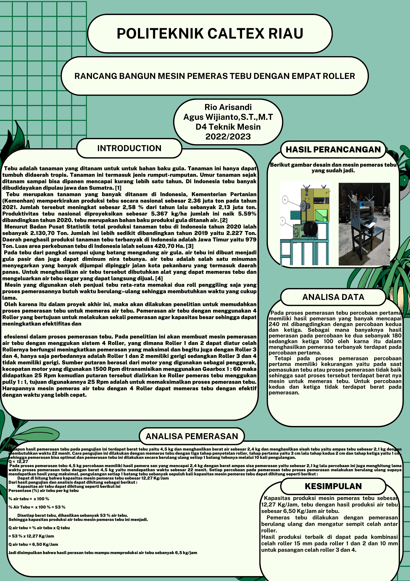 Kata kunci : Tebu, motor ac, Roller pemeras tebu, puli, sabuk-v, jaring kawat.
