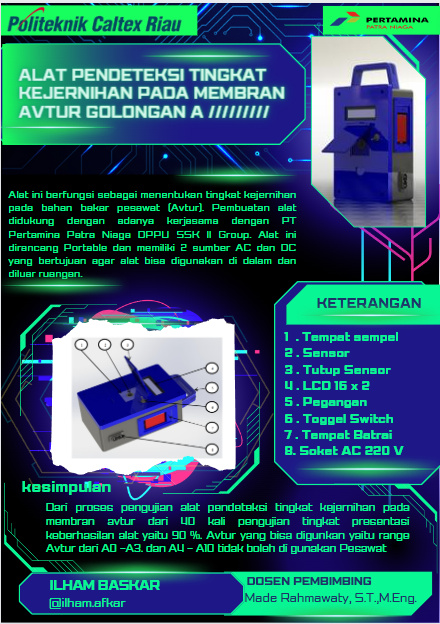 Pesawat udara merupakan suatu kemajuan teknologi yang sangat luar biasa bagi dunia. Melalui pesawat udara hubungan antar negara- negara di dunia semakin mudah. Pesawat memiliki jenis bahan bakar yang berjenis aviation turbine fuel (ATF) ataupun Avture (Aviation Turbine). Bahan bakar jet fuel atau Aviation Turbine Fuel (ATF) ataupun Avture (Aviation Turbine) merupakan salah satu jenis bahan bakar penerbangan yang dirancang untuk digunakan pada pesawat terbang yang bermesin turbin gas. Avture memiliki tingkatan kuliatas standarnya yaitu dengan melihat tingkat kekeruhan di Avturenya, pengujian ini bisa dilakukan dengan mengunakan pengujian pada membran. PT Pertamina Patra Niaga DPPU SSK II group menyatakan kendala yang dihadapi sekarang adalah proses pengecekan membran Avture yang terbilang lama karena setelah proses pengambilan membran dilapangan harus kembali dulu ke laboratorium untuk mengetahui tingkat kekeruhan pada membran Avture tersebut. Dari permasalahan yang didapat, timbulah ide unutk membuat Alat Pendeteksi Skala Warna pada Membran Avture dengan Sistem Pengolah Citra Berbasis Arduino. Alat ini menggunakan sensor warna untuk mendeteksi tingkat kekeruhan pada membrane, nantinya data yang didapat dari sensor akan diproses Arduino Uno. Hasil pengolahan data akan ditampilkan pada layer LCD (Liquid Crystal Display) 16x2. Alat ini dapat memudahkan para pekerja sekaligus mempercepat proses pengecekan kekeruhan pada membran. Dari percobaan 4 kali pengujian didapat rata-rata dari setiap membrane avture, pada percobaan membrane red didapat rata-rata percobaan yaitu 246,49, pada percobaan membrane green didapat rata-rata percobaan yaitu 411,022, pada percobaan membrane blue didapat rata- rata percobaan yaitu 725,124, pada percobaan membrane clear didapat rata-rata percobaan yaitu 1170,2. Dari Pengujian didapatkan 90% yang sesuai dengan alat dan dan pembacaan operator.