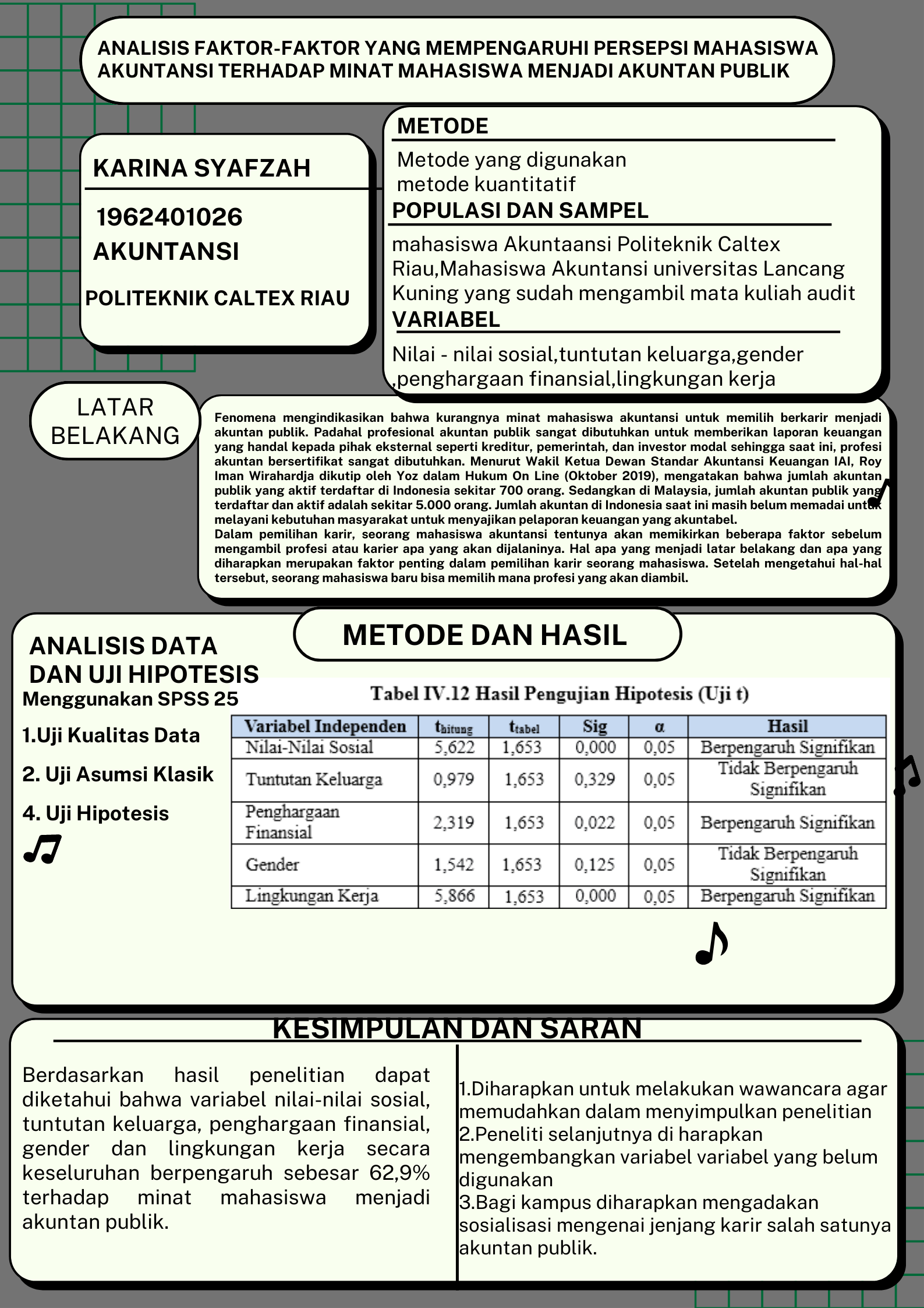 Kata kunci: nilai-nilai sosial, tuntutan keluarga, penghargaan finansial, gender, lingkungan kerja dan minat mahasiswa menjadi akuntan publik.