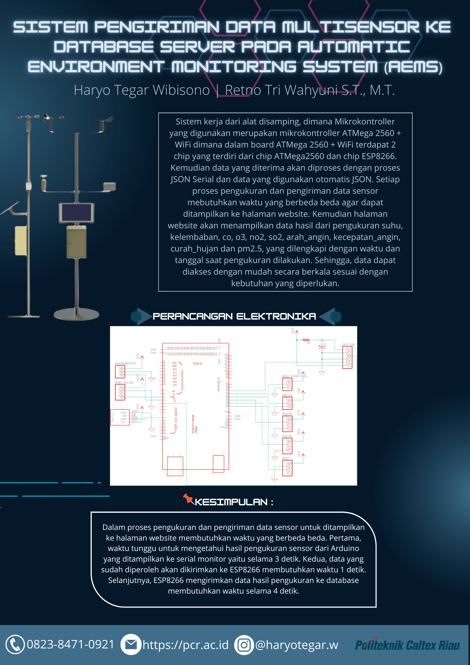 Automatic Environment Monitoring System (AEMS) adalah alat pemantau lingkungan yang dapat menginformasikan kondisi cuaca dan udara secara aktual dengan menampilkan data pada serial monitor dan LCD. Agar memudahkan dalam melihat informasi cuaca dan udara, Automatic Environment Monitoring System (AEMS) dibantu dengan pengiriman data multisensor ke database server. Penggunaan database server yaitu untuk menyimpan data dan menjaga keamanan data agar dapat diakses dalam suatu waktu tanpa mengganggu data yang satu dengan data yang lainnya. Mikrokontroller yang digunakan merupakan mikrokontroller ATMega 2560 + WiFi dimana dalam board ATMega 2560 + WiFi terdapat 2 chip yang terdiri dari chip ATMega2560 dan chip ESP8266. Kemudian data yang diterima akan diproses dengan proses JSON Serial dan data yang digunakan otomatis JSON. Setiap proses pengukuran dan pengiriman data sensor mebutuhkan waktu yang berbeda beda agar dapat ditampilkan ke halaman website. Kemudian halaman website akan menampilkan data hasil dari pengukuran suhu, kelembaban, co, o3, no2, so2, arah_angin, kecepatan_angin, curah_hujan dan pm2.5, yang dilengkapi dengan waktu dan tanggal saat pengukuran dilakukan. Sehingga, data dapat diakses dengan mudah secara berkala sesuai dengan kebutuhan yang diperlukan.