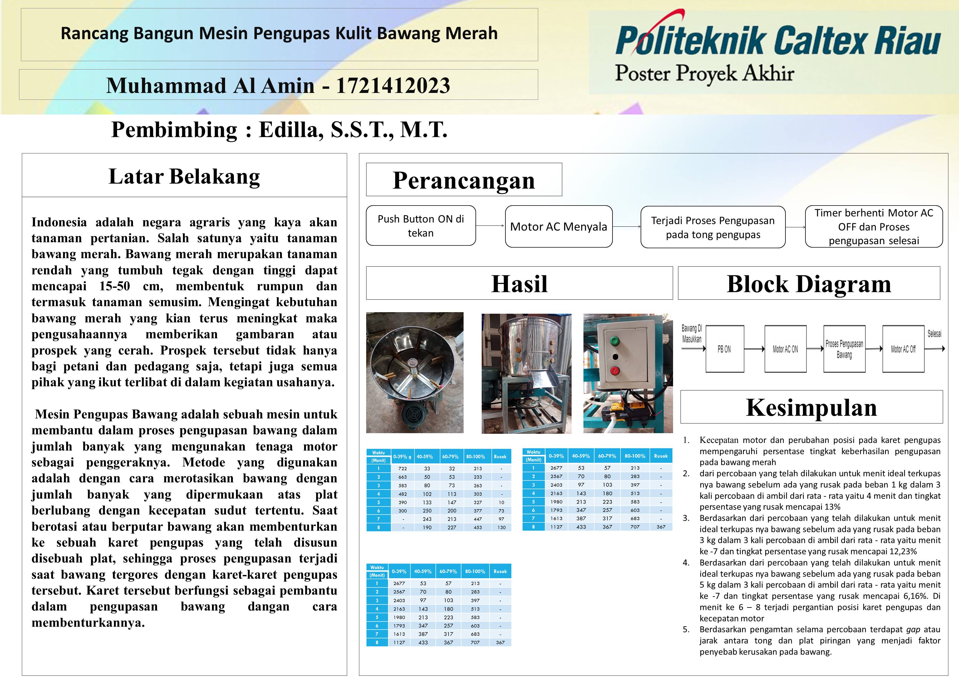 Proses pengupasan kulit bawang merah di Riau dan Sumatra pada umumnya masih menggunakan alat sederhana dan manual, karena masyarakat belum begitu paham tentang alat pembuatan Pegupas Kulit Bawang Merah ini dan tingkat efisiensi alat yang masih kurang. Proses produksi bawang merah pada usaha UMKM dan industry rumahan masih banyak terkendala oleh terbatasnya sumber daya yang digunakan salah satunya dalam proses pengupasan bawanh merah sebagai bahan baku pangan. Dengan menggunakan mesin pengupas bawang ini akan memangkas waktu pengupasan dan tenaga dalam waktu yang lama yang masih dilakukan secara manual. Adapun tujuan dari penulis tugas akhir ini adalah Merancang bangun suatu model alat pengupas bawang yang mekanis dengan tong yang di berikan karet – karet pengupas pada dinding – dinding nya, kemudian di gerakkan oleh motor yang di kontrol dalam sebuah rangkaian elektro. Proses dari mesin ini berawal dari menimbang bawang yang hendak di kupas, bawang akan ditaruh pada tong yang di sertai mekanik plat besi yang akan berputar nanti nya. Pengontrolan sistem elektonika dilakukan secara sekuensial yang lebih tepat guna pada penerapannya. Penggerak utama pada pengupasan nya adalah motor 1 phasa dan menggunakan dimmer untuk mengatur kecepatan putar motor 1 phasa.