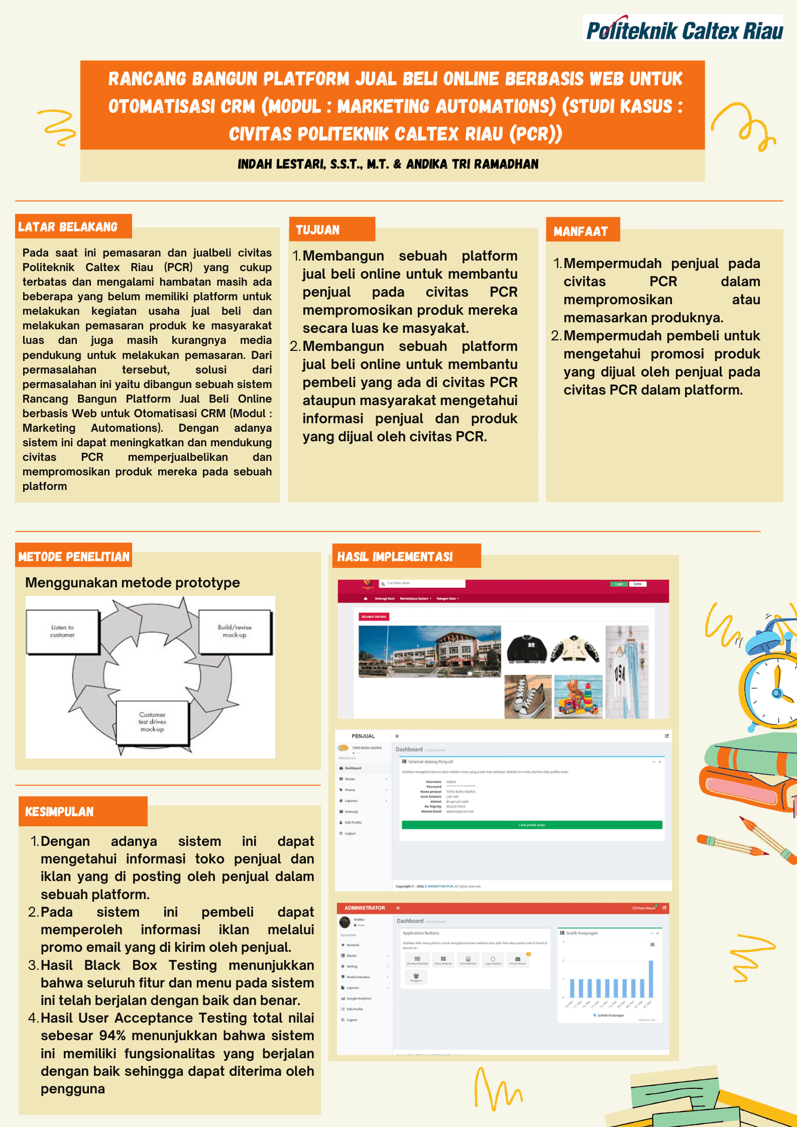 Di dalam peranan PCR untuk menghasilkan para lulusan yang berkualitas dan berprestasi dalam bidang akademik, disamping itu terdapat juga di dalam ruang lingkup civitas pcr yang mempunyai usaha atau bisnis untuk mendapatkan penghasilan. Kendala yang dihadapi oleh penjual pada civitas pcr adalah adanya hambatan dalam mempromosikan produk yang mereka jual kepada masyarakat luas. Berdasarkan masalah yang dihadapi, maka pada penelitian ini dibangun yaitu Rancang Bangun Platform Jual Beli Online berbasis Web untuk Otomatisasi CRM (Modul : Marketing Automations). Penelitian ini berfokus membahas modul Marketing Automation (MA), Sistem ini dibangun menggunakan PHP (Hypertext Processor) sebagai bahasa pemrogaman dan MySQL sebagai database. Metode menggunakan Prototype, karena terdapat beberapa kelebihan yaitu melibatkan user dalam analisa dan desain, punya kemampuan menangkap requirement secara konkret, digunakan untuk memperluas System Delopment Life Cycle (SDLC). Metode ini dilakukan dalam 3 kali iterasi. Hasil dari iterasi telah di implementtasikan dengan baik dalam sistem yang dibangun. Hasil pengujian black box testing menyatakan bahwa system dapat berjalan dengan baik. Hasil pengujian UAT 94% untuk menilai sistem ini memiliki fungsionalitas yang dapat berjalan dengan baik dan diterima oleh pengguna.