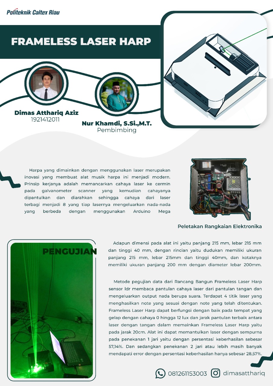Alat musik harpa merupakan sebuah alat musik konvensional yang dimainkan dengan cara dipetik. Alat musik ini mengeluarkan suara dari senar yang dipetik. Warna suara yang dikeluarkan bergantung pada senar yang terpasang pada harpa tersebut. Semakin banyak senar yang terpasang pada harpa tersebut, maka semakin banyak pula suara yang dapat dihasilkan oleh harpa tersebut. Harpa yang dimainkan dengan menggunakan laser merupakan inovasi yang membuat alat musik harpa ini menjadi modern. Prinsip kerjanya adalah memancarkan cahaya laser ke cermin pada galvanometer scanner yang kemudian cahayanya dipantulkan dan diarahkan sehingga cahaya dari laser terbagi menjadi 8 yang tiap lasernya mengeluarkan nada-nada yang berbeda dengan menggunakan Arduino Mega. Adapun dimensi pada alat ini yaitu panjang 215 mm, lebar 215 mm dan tinggi 40 mm, dengan rincian yaitu dudukan memiliki ukuran panjang 215 mm, lebar 215mm dan tinggi 40mm, dan kotaknya memiliki ukuran panjang 200 mm dengan diameter lebar 200mm. Metode pegujian data dari Rancang Bangun Frameless Laser Harp sensor ldr membaca pantulan cahaya laser dari pantulan tangan dan mengeluarkan output nada berupa suara. Terdapat 4 titik laser yang menghasilkan note yang sesuai dengan note yang telah ditentukan. Frameless Laser Harp dapat berfungsi dengan baik pada tempat yang gelap dengan cahaya 0 hingga 12 lux dan jarak pantulan terbaik antara laser dengan tangan dalam memainkan Frameless Laser Harp yaitu pada jarak 20cm. Alat ini dapat memantulkan laser dengan sempurna pada penekanan 1 jari yaitu dengan persentasi keberhasilan sebesar 57,14%. Dan sedangkan penekanan 2 jari atau lebih masih banyak mendapati error dengan persentasi keberhasilan hanya sebesar 28,57%.