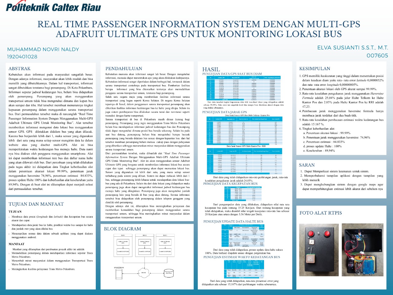 Kebutuhan akan informasi pada masyarakat sangatlah besar. Dengan adanya informasi, masyarakat akan lebih mudah dan bisa memilih yang dibutuhkannya. Dalam hal transportasi, informasi sangat dibutuhkan terutama bagi penumpang. Di Kota Pekanbaru, Informasi seputar jadwal kedatangan bus, belum bisa didapatkan oleh penumpang. Penumpang yang akan menggunakan transportasi umum tidak bisa mengetahui dimana dan kapan bus akan sampai dan tiba. Hal tersebut membuat menurunnya tingkat kepuasan penumpang dalam menggunakan sarana transportasi bus. Dari permasalahan tersebut maka di rancanglah “Real Time Passenger Information System Dengan Menggunakan Multi- GPS Adafruit Ultimate GPS Untuk Monitoring Busâ€. Alat tersebut memberikan informasi mengenai data lokasi bus menggunakan sensor GPS. GPS diletakkan didalam bus yang akan dilacak. Karena bus berjumlah lebih dari 1, maka sensor yang digunakan lebih dari satu yang mana setiap sensor mengirim data ke dalam website atau yang disebut multi-GPS. Alat ini bisa memperkirakan waktu kedatangan bus menuju halte. Data nanti nya bisa diakses oleh pengguna menggunakan smartphone. Alat ini dapat memberikan informasi rute bus dan daftar nama halte yang akan dilewati oleh bus. Dari percobaan yang telah dilakukan pada tugas akhir ini didapatkan data Tingkat keberhasilan alat dalam penentuan akurasi lokasi 99.99%, penentuan jarak menggunakan haversine 74,96%, penentuan estimasi 84.833%, proses update Halte 100% dan keberhasilan alat keseluruhan yaitu 89,94%. Dengan di buat alat ini diharapkan dapat menjadi solusi dari permasalahan tersebut. Kata Kunci : Real-Time Passenger Information System, GPS, Informasi, Bus, rute bus, membaca data posisi (longitude dan latitude)