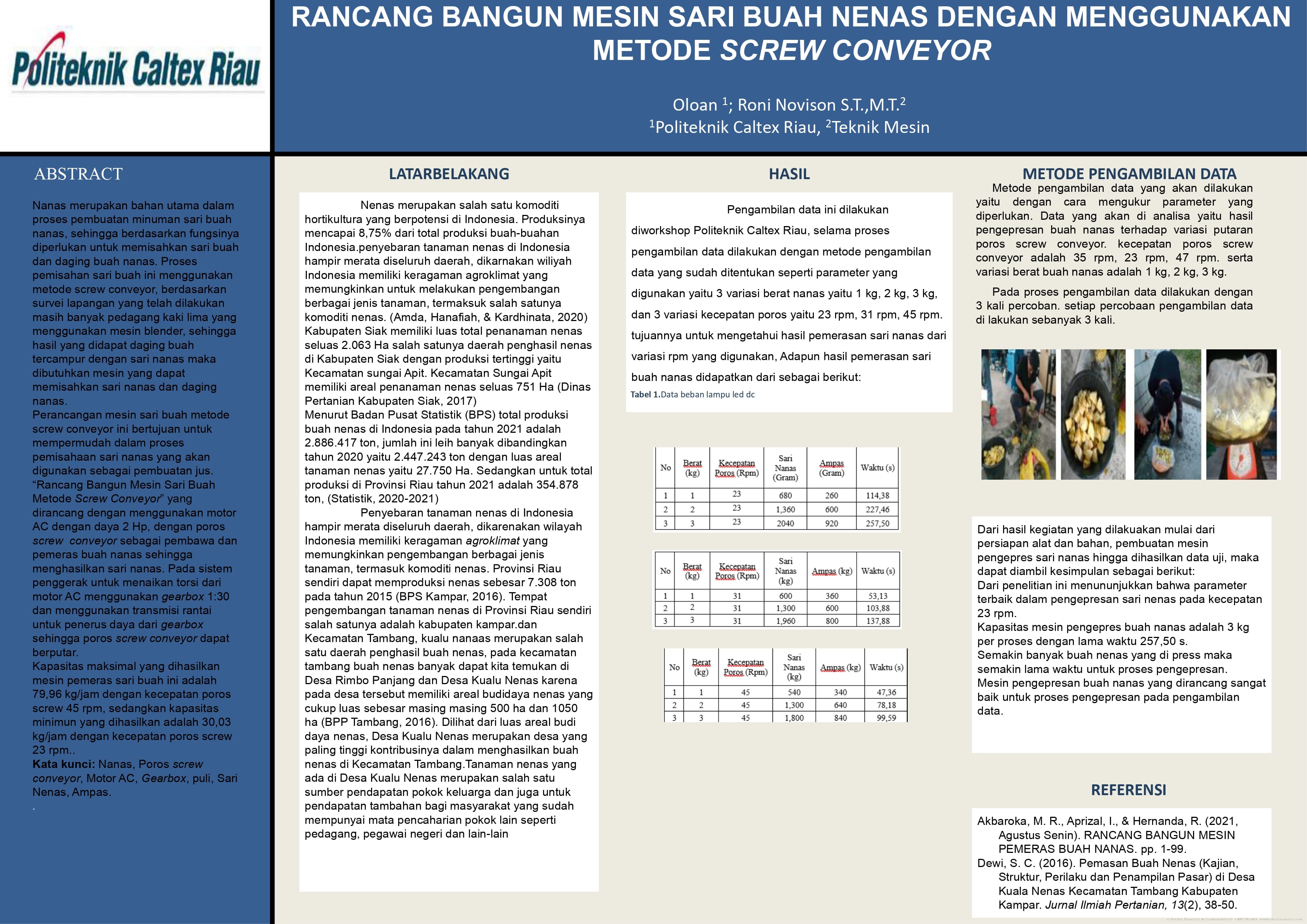 Kapasitas mesin pengepras sari buah nenas adalah 3 kg dalam sekali proses pengepresan. Hasi sari yang didapatkan adalah 2,04 kg dari pengerasan maksimal dan ampas nenas nya adalah 0,920 kg mengguanakan 23 Rpm screw conveyor dan lama pengepresan 4 menit 17 detik. Dari proses pengepresan sari buah nenas didapatkan hasil proses pengerasan yang baik untuk memisahkan sari nenas dengan ampasnya.