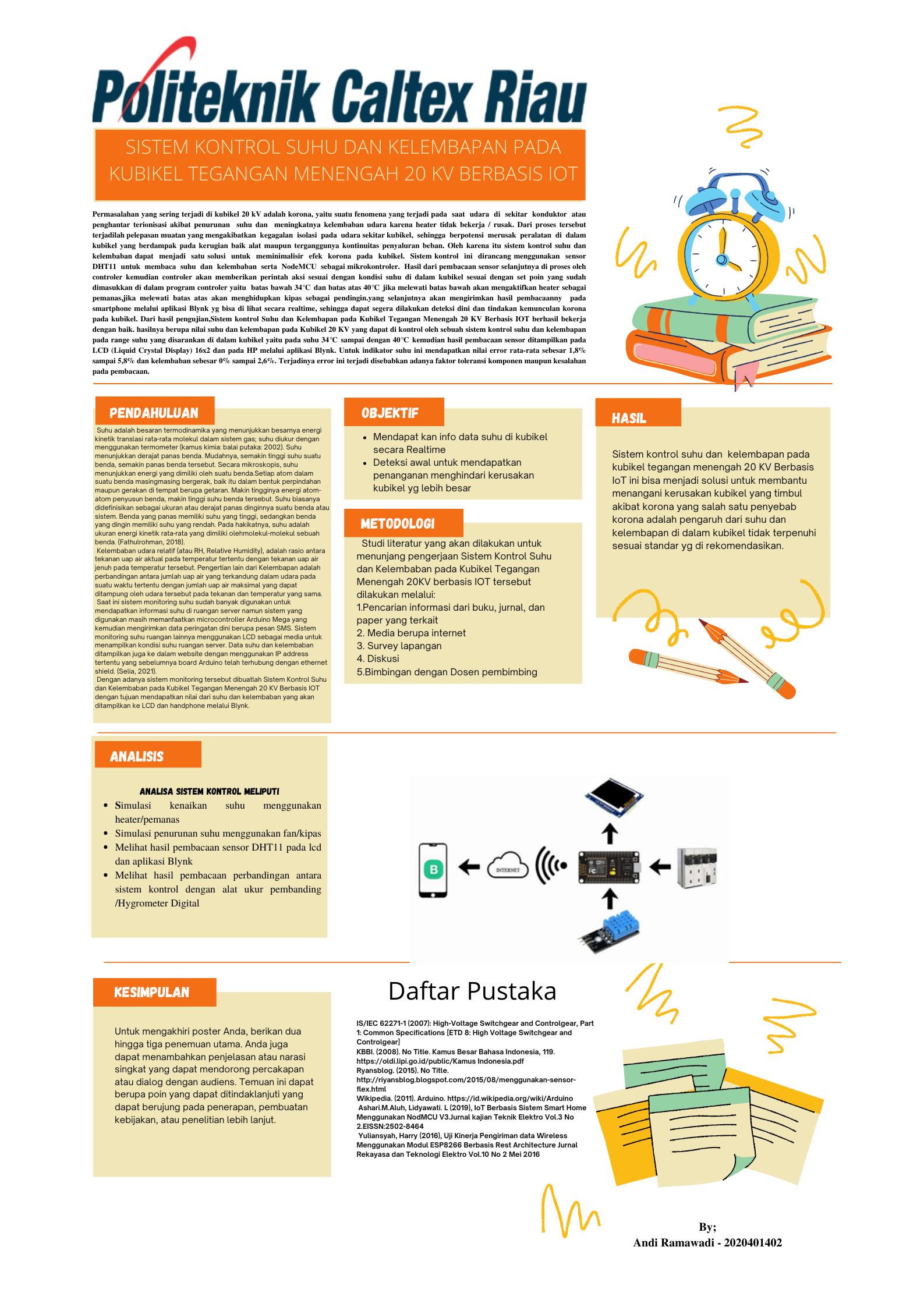 Sistem kontrol Suhu dan Kelembaban pada Kubikel Tegangan Menengah 20 KV Berbasis IOT adalah suatu alat berfungsi untuk mengambil data berupa suhu dan kelembaban kubikel menengah 20 KV kemudian ditampilkan dalam LCD (Liquid Crystal Display) 16x2 dan pada HP melalui aplikasi Blynk. Suhu diartikan sebagai ukuran kuantitatif dari temperatur, panas atau dingin, dan diukur menggunakan thermometer. Kelembapan adalah perbandingan antara jumlah uap air yang terkandung dalam udara pada suatu waktu tertentu dengan jumlah uap air maksimal yang dapat ditampung oleh udara tersebut pada tekanan dan temperatur yang sama Untuk memudahkan pengontrolan suhu dan kelembaban pada kubikel ini dibuatlah sistem kontrol Suhu dan Kelembaban yang ditampilkan pada LCD (Liquid Crystal Display) 16x2 dan HP dengan menggunakan NodeMCU ESP8266 sebagai penghubung antara Hp dan mikrokontroller, kemudian alat ini menggunakan sensor suhu DHT11 untuk mengukur suhu dan kelembaban, hasil dari pembuatan Sistem kontrol Suhu dan Kelembapan pada Kubikel Tegangan Menengah 20 KV Berbasis IOT berhasil di buat dengan hasil berupa nilai suhu dan kelembapan pada Kubikel 20 KV yang dapat di kontrol oleh sebuah sistem kontrol suhu dan kelembapan pada range suhu yang disarankan di dalam kubikel yaitu pada suhu 34℃ sampai dengan 40℃ kemudian hasil pembacaan sensor ditampilkan pada LCD (Liquid Crystal Display) 16x2 dan pada HP melalui aplikasi Blynk. Untuk indikator suhu ini mendapatkan nilai error rata-rata sebesar 1,8% sampai 5,8% dan kelembaban sebesar 0% sampai 2,6%. Terjadinya error ini terjadi disebabkan adanya faktor toleransi komponen maupun kesalahan pada pembacaan.
