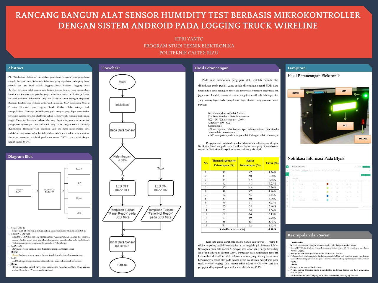 PT. Weatherford Indonesia merupakan perusahaan penyedia jasa pengeboran minyak dan gas bumi. Salah satu kebutuhan yang diperlukan pada pengeboran minyak dan gas bumi adalah Logging Truck Wireline. Logging Truck Wireline bertujuan untuk menemukan lapisan-lapisan formasi yang mengandung hidrokarbon (minyak dan gas) dan sangat membantu untuk melakukan perkiraan besarnya cadangan hidrokarbon yang ada di dalam suatu lapangan eksplorasi. Berbagai kendala yang dialami ketika tidak mengikuti SOP penggunaan System Peralatan Elektronik pada Logging Truck Wireline. Salah satunya tidak memperhatikan Humidity (Kelembapan) pada ruangan yang dapat menyebakan kerusakan system peralatan elektronik ketika Humidity pada ruangan truck sangat tinggi. Untuk itu diperlukan sebuah alat yang dapat mengukur dan memonitor penggunaan system peralatan elektronik yang sesuai dengan standar Humidity (Kelembapan Ruangan) yang diizinkan. Alat ini dapat memonitoring serta melakukan pengukuran suhu dan kelembaban pada truck wireline secara realtime dan dapat menerima notifikasi pembacaan sensor DHT-11 pada blynk dengan tingkat akurasi 95.1%.