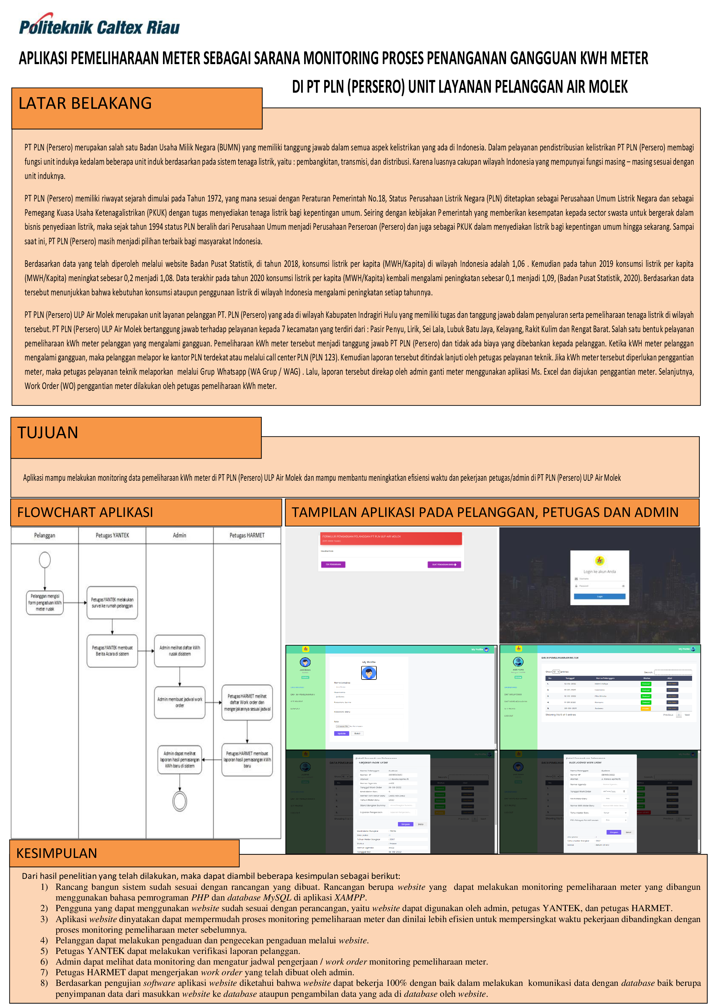 PEMBUATAN APLIKASI PEMELIHARAN METER SEBAGAI SARANA MONITORING PROSES PENANGANAN GANGGUAN KWH METER DI PT PLN (PERSERO) UNIT LAYANAN PELANGGAN AIR MOLEK.