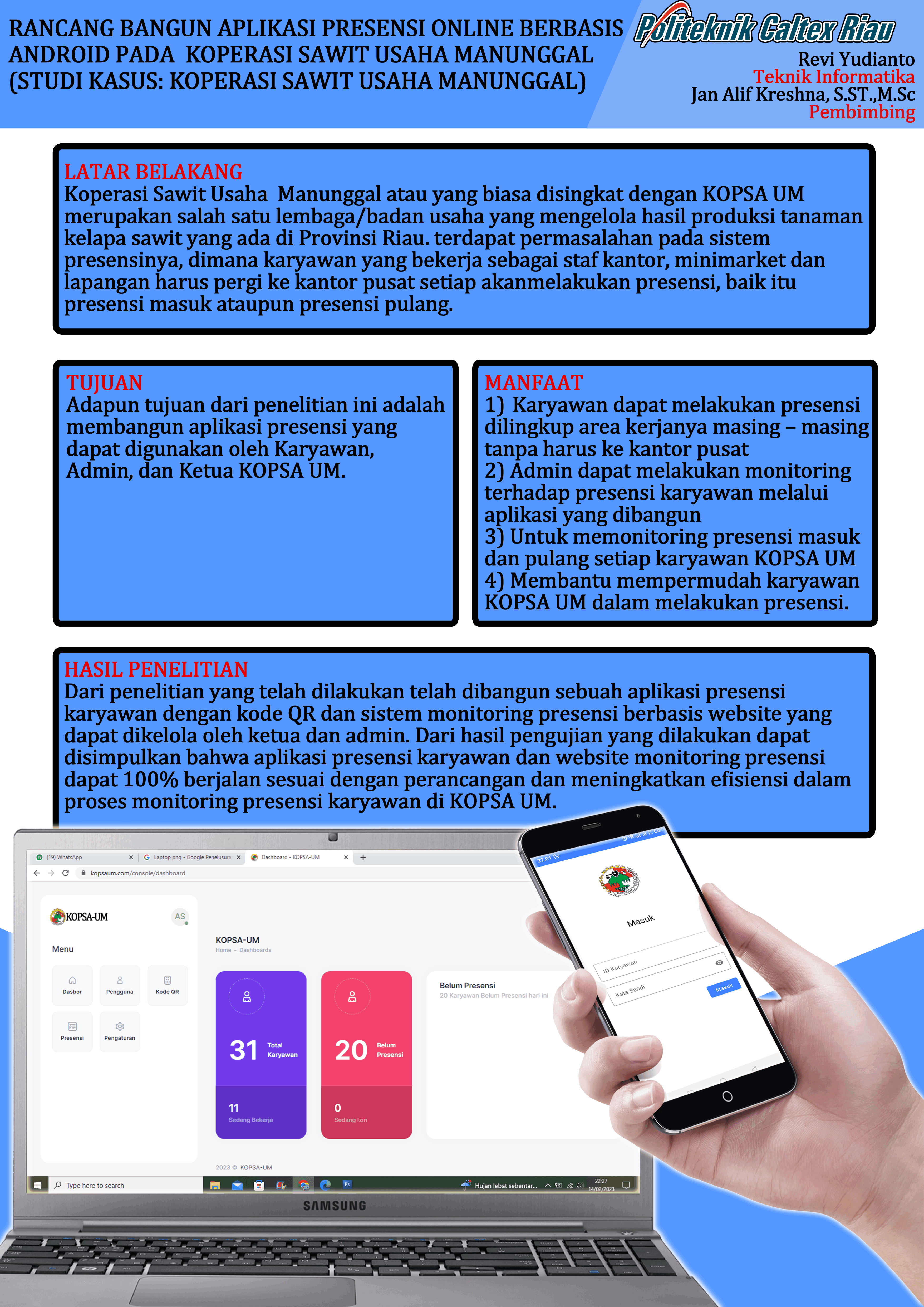 Koperasi Sawit Usaha Manunggal atau yang biasa disingkat dengan KOPSA UM merupakan salah satu lembaga/badan usaha yang mengelola hasil produksi tanaman kelapa sawit yang ada di Provinsi Riau. KOPSA UM memiliki beberapa unit usaha, diantaranya yaitu: Unit Kebun, Unit Simpan Pinjam, dan Unit Waserda/UM Mart. Unit – unit tersebut dibuat dalam rangka mencapai tujuan koperasi yaitu menciptakan kesejahteraan kepada para anggota koperasi. Sama halnya dalam setiap lembaga/badan usaha, di KOPSA UM karyawan diwajibkan untuk melakukan presensi sebelum dan setelah bekerja. Presensi ini akan mempengaruhi penilaian kinerja dan gaji yang diterima oleh karyawan. Namun, di KOPSA UM terdapat permasalahan pada sistem presensinya, dimana karyawan yang bekerja sebagai staf kantor, minimarket dan lapangan harus pergi ke kantor pusat setiap akan melakukan presensi, baik itu presensi masuk ataupun presensi pulang. Hal ini tentu mempengaruhi kinerja para karyawan, terutama karyawan minimarket dan karyawan lapangan. Untuk itu penelitian ini bertujuan membuat aplikasi presensi online berbasis android yang dapat digunakan untuk men-scan barcode ketika melakukan presensi di posko – posko yang telah tersedia. Diharapkan dengan aplikasi yang dibangun nantinya dapat mengatasi permasalahan yang ada dan dapat mencapai tujuan sesuai dengan yang diharapkan.