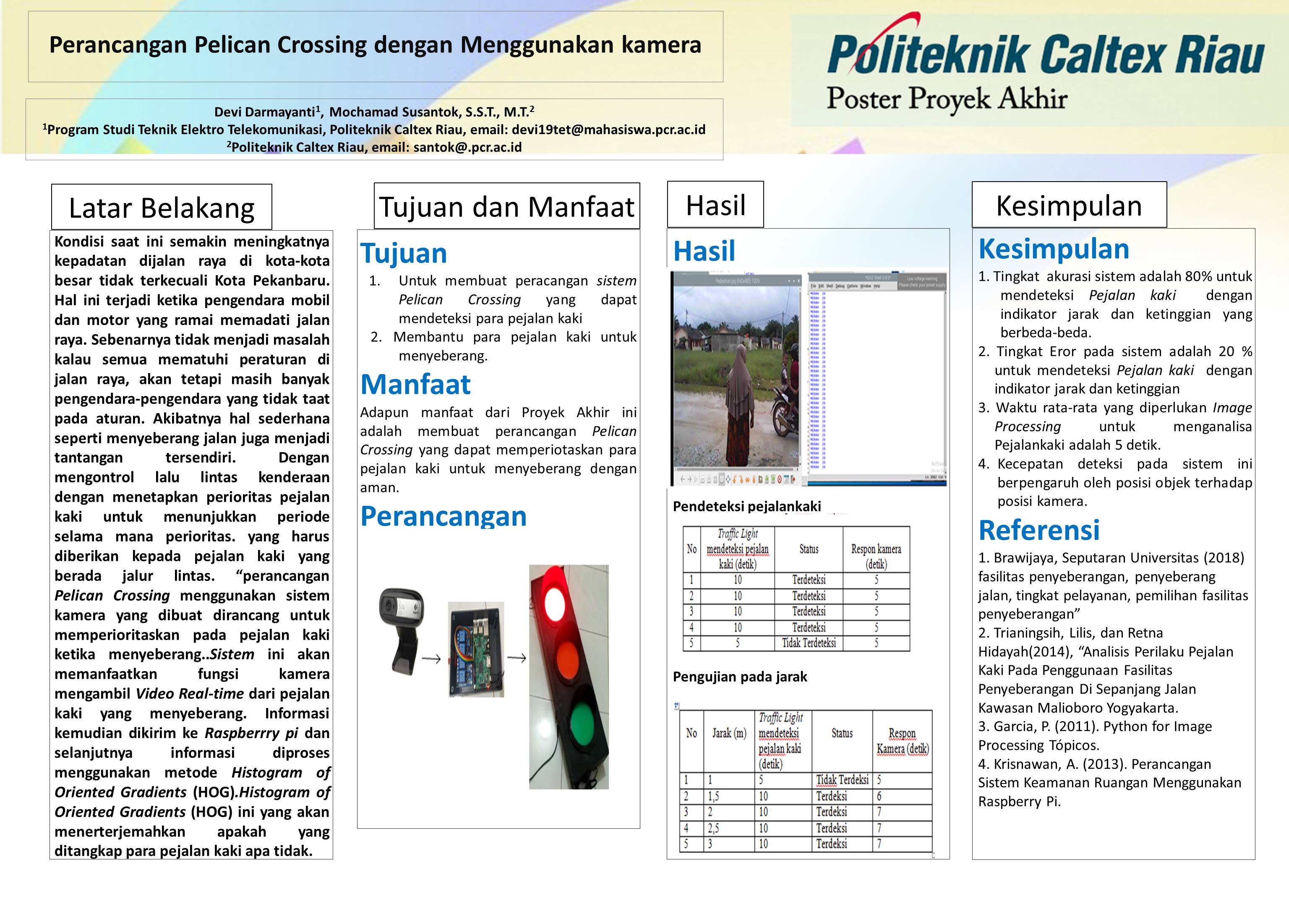 Pemerintah melalui undang-undang No.22 Tahun 2019 tentang Lalu lintas dan Angkutan jalan Mengeluarkan Inovasi yang berupa Penyeberangan Pejalankaki. Salah satu tempat Penyeberangan Pejalankaki yaitu Pelican Crossing. Pelican Crossing merupakan suatu fasilitas penyeberangan jalan bagi pejalankaki yang dilengkapi dengan lampu lalu lintas untuk menyeberang jalan dengan aman dan nyaman. Namun Banyak Pengendara-pengendara tidak taat pada aturan, seperti menyeberangi jalan juga menjadi tantangan tersendiri. Untuk itu pada Proyek Akhir ini dibuatkan sistem yang menggunakan Webcam sebagai Penangkap Citra serta Raspberry pi Sebagai Pengontrol jalannya sistem. Metode untuk mendeteksi pejalankaki menggunakan HOG (Histogram of Oriented Gradients). Waktu yang diperlukan dalam memproses Image Processing pada Webcam menjadi merah 6 detik dengan lamanya mendeteksi pejalankaki terlama yaitu 20 detik dengan posisi ketinggian kamera 15 dan 30 cm dan kembali normal setelah tidak terdeteksi lagi pejalankaki.