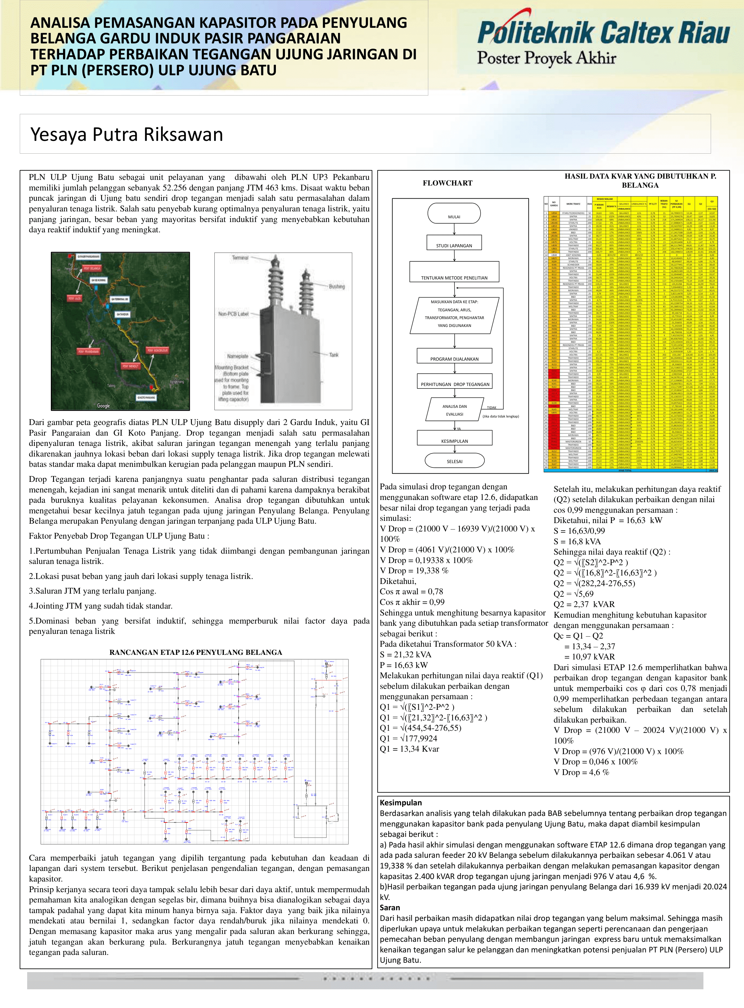 Distribusi energi listrik dari pusat pembangkit (power plant) hingga sampai ke konsumen yang letaknya berjauhan selalu mengakibatkan terjadinya suatu drop tegangan. Drop tegangan yang cukup besar akan mengakibatkan rendahnya tegangan yang diterima oleh konsumen terutama yang berada di ujung saluran jaringan tegangan menengah (JTM). Metode untuk memperbaiki terjadinya drop tegangan pada sistem distribusi jaringan tegangan menengah (JTM) 20 kV di suatu feeder diantaranya adalah dengan melakukan rekonduktor penghantar dengan mengganti luas penampang kabel menjadi lebih besar, pelimpahan beban ke feeder lain, pemasangan Tap Changer pada transformator dan pemasangan kapasitor bank. Tugas Akhir ini menganalisis pengaruh drop tegangan sebelum dan sesudah dilakukan pemasangan kapasitor bank. Dalam perhitungannya dibantu dengan software ETAP 12.6 untuk simulasi. Proyek Akhir ini dilakukan pada penghantar jenis AAAC 70 mm² dan 240 mm2 pada faktor daya 0,78. Sehubungan dengan efisiensi waktu dan menekan biaya material untuk perbaikan tegangan. Pemasangan kapasitor untuk menurukan nilai drop tegangan menjadi metode yang lebih baik dari metode yang lain.